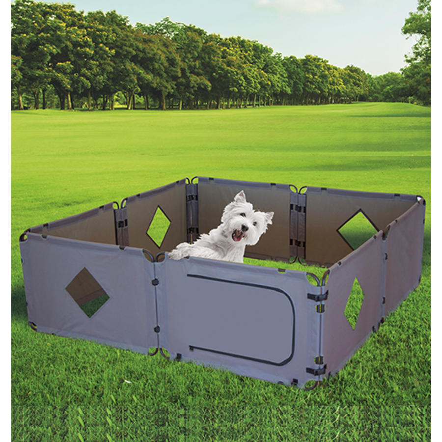 Bærbar hundegning for camping og friluftsliv. Kan monteres med seksjonene liggende for en større hage eller stående for å gi mer høyde. Festes i bakken med de medfølgende teltplugger. Nettdør på en seksjon.