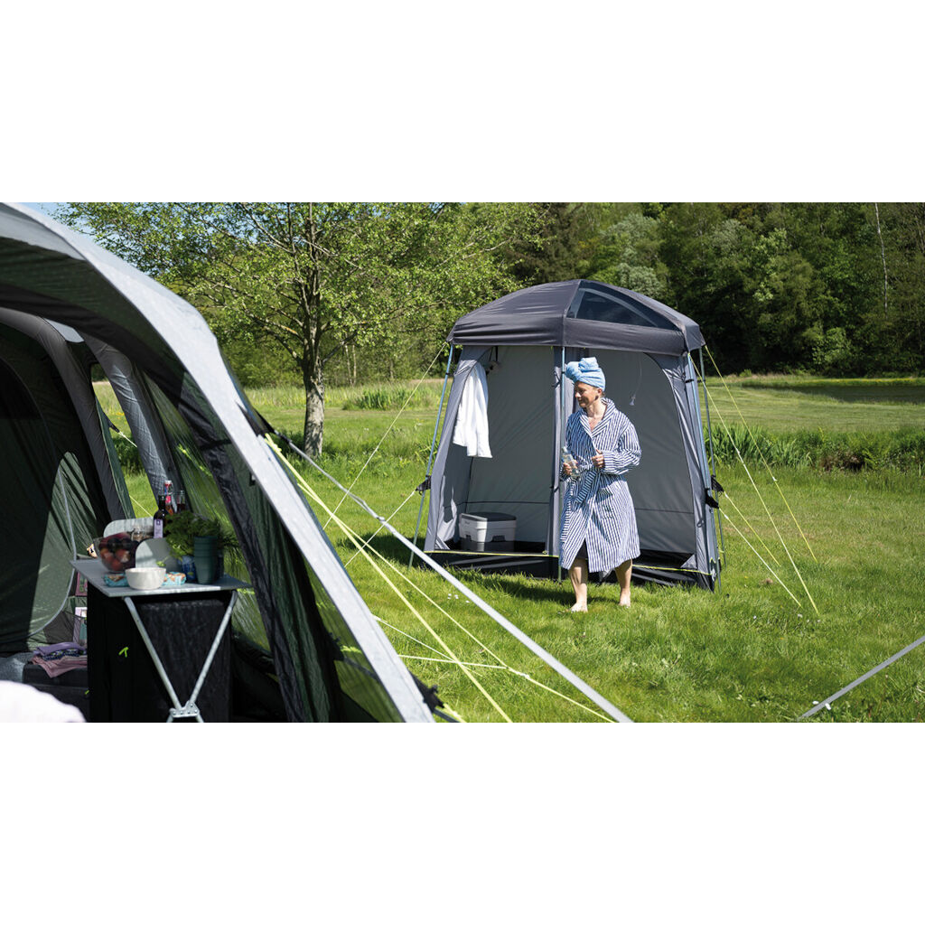 Raskt oppsett dobbelt toalett- / dusj telt fra danske Outwell. Teltet er utviklet som et portabelt bad for dere campere som ønsker eget toalett, dusj og omkledningsrom. Integrert gulv med drenering gir en mer behagelig dusjopplevelse og holder føttene fri for sand og smuss. God ventilasjon i taket med en hylle for en soldusj. En smart detalj er et vinduspanel i taket som gjør det mulig for solen å skinne og varme opp vannet i solduschen. Det finnes også en dør mellom de ulike seksjonene med magnetlist som gjør det enkelt å ta seg mellom hvis man f.eks. skal dusje og skifte.