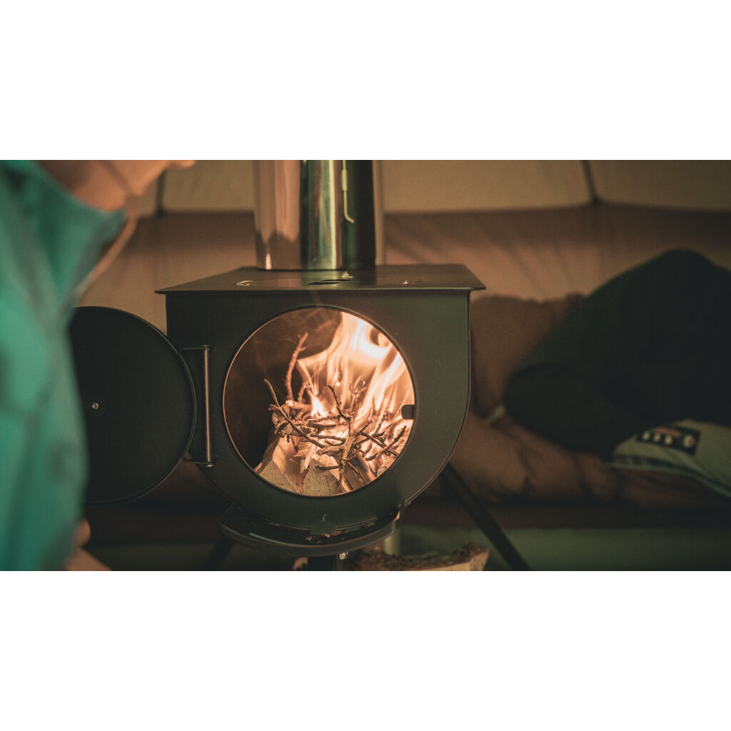 En mycket lättmonterad tältkamin med matlagningsyta, spjäll i skorsten, genomföringsskydd och gnistskydd. Förbränningen styrs via att luckan kan öppnas stegvis samt via spjället i skorstenen. Kaminen klarar tält med en höjd upp till skorstensöppningen på upp till 355 cm. Höjden på skorstenen ändras genom att ta bort en eller flera sektioner. När den inte används förvaras skorstenen i spisen och benen viks in för att få så liten packstorlek som möjligt. Det ingår även en väska för transport och förvaring.