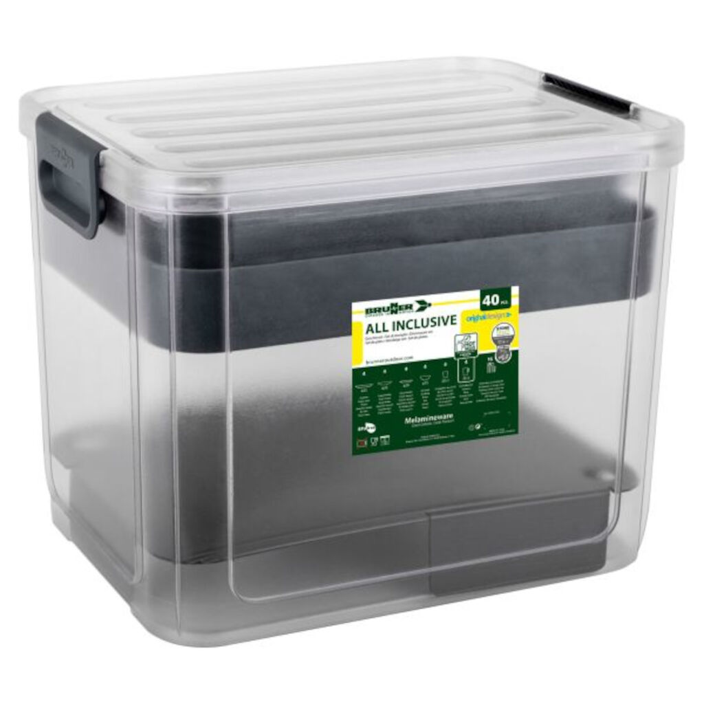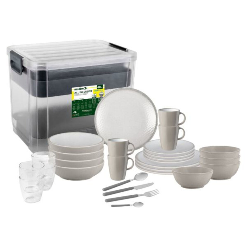 Komplett servise for fire personer med tallerkener, kopper, glass og bestikk. Alt i en praktisk boks. Perfekt for dere som er helt nye i campinglivet. Tallerkener og kopper i en kraftigere melamin med non-slip som gjør at de både har en god følelse og ligger godt på bordet og i skapet selv om det luter. Totalt 40 deler inngår i servisen.