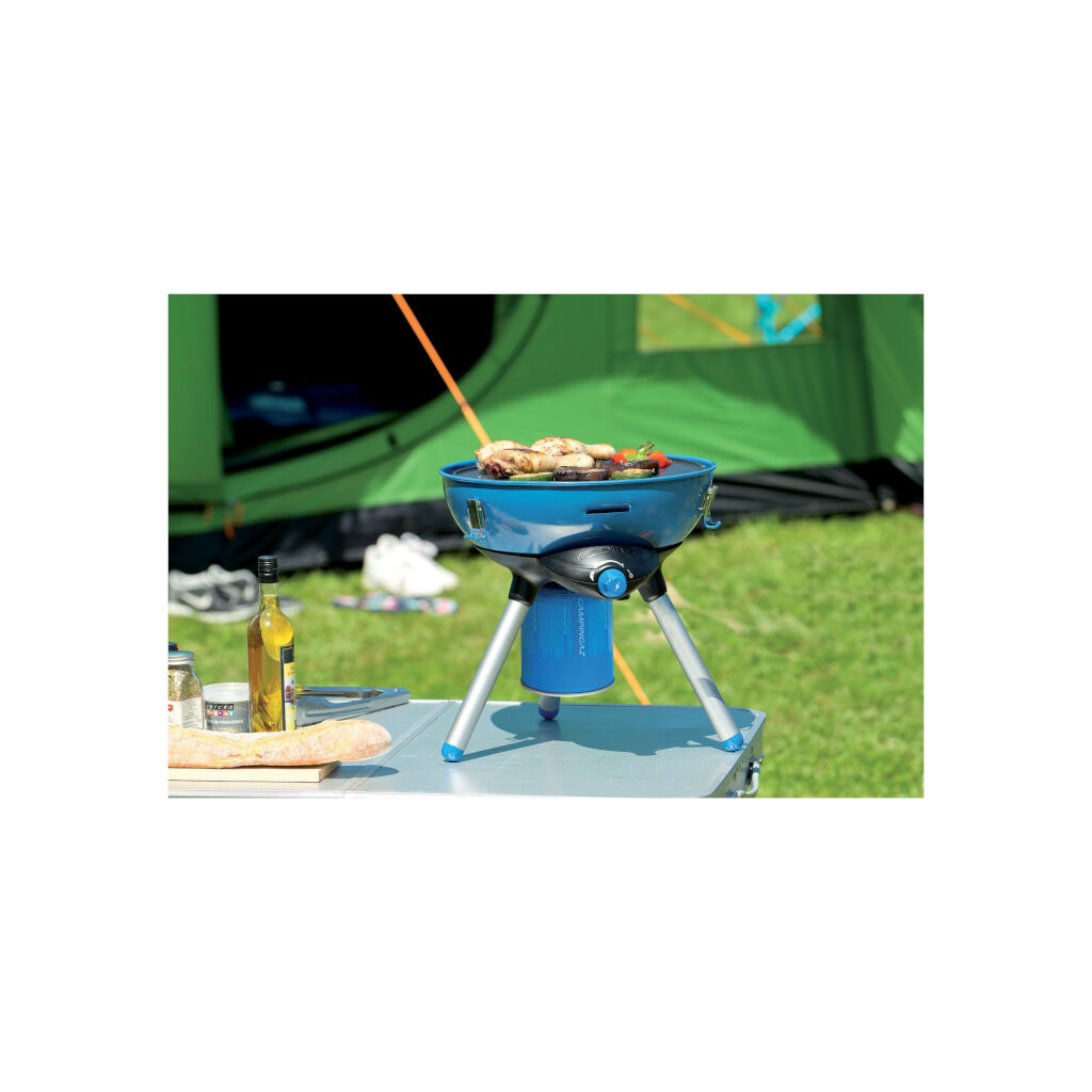 Party Grill 400 CV fra Campingaz er en allsidig gassgrill med en grillflate Ø34 cm som er litt større enn de fleste lignende kompaktgriller. Takket være gryteholderen kan grillen også brukes med vanlige gryter og panner. Grillen kommer i tillegg med grillrist, en stekeplate med en glatt side og en rillede side, samt et lokk som kan brukes som wokpanne. Perfekt for teltcamping, utflukter, campingvogn eller bobil. Dens brenner på 2000W og enkle kontrollknapper gir en enkel og effektiv grilling. Benene pakkes enkelt sammen i grillen for transport, og grillen pakkes deretter i den medfølgende vesken. Enkelt og smidig.