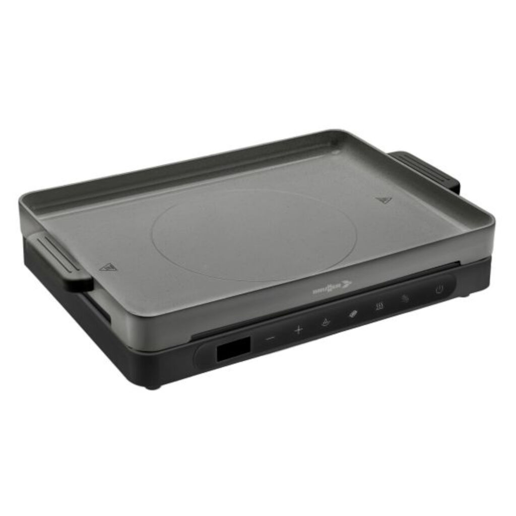 Bærbar induksjonsplate med avtakbar stekeplate med god varmefordeling i moderne design. Touch-kontroll og LED-skjerm som viser effekt og temperaturnivå.