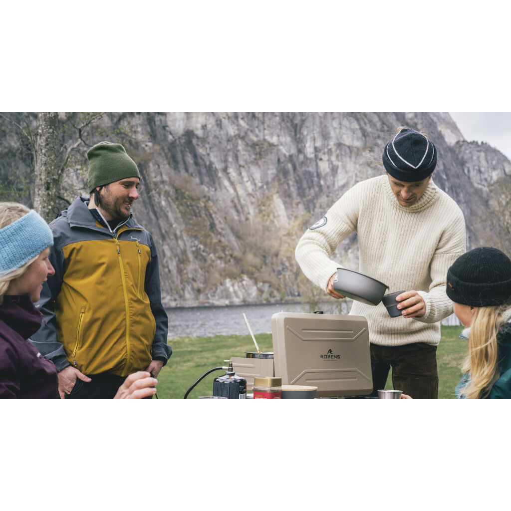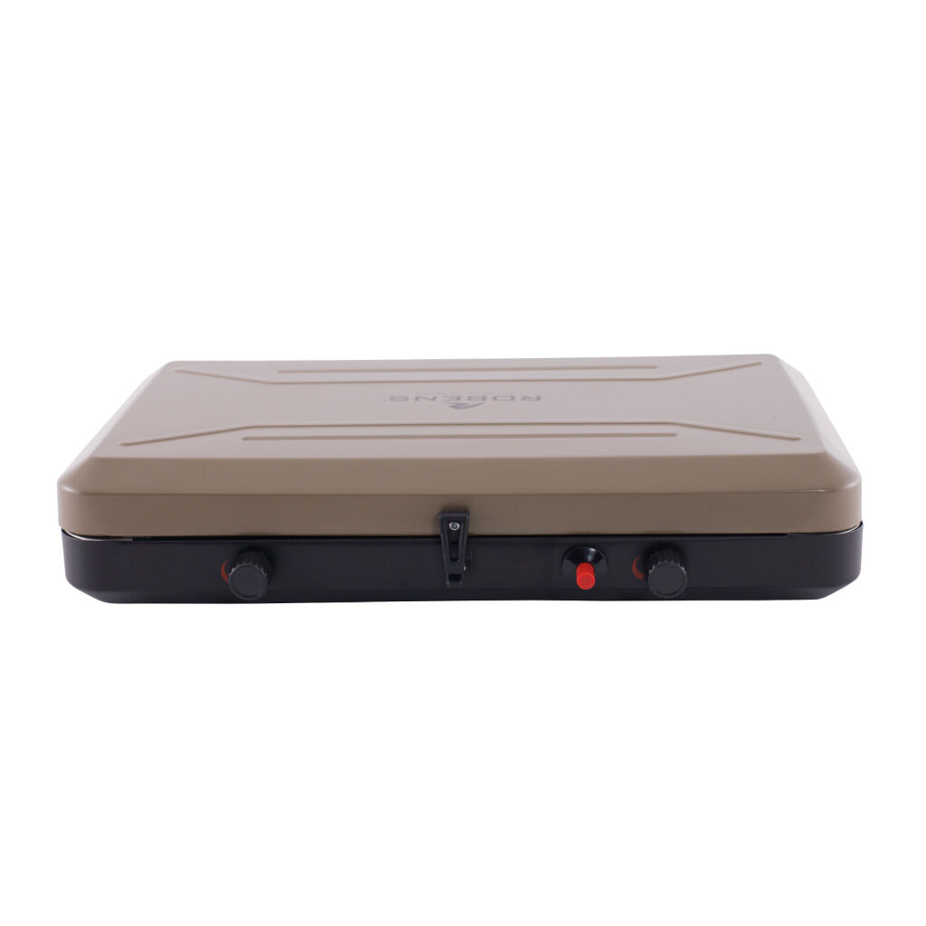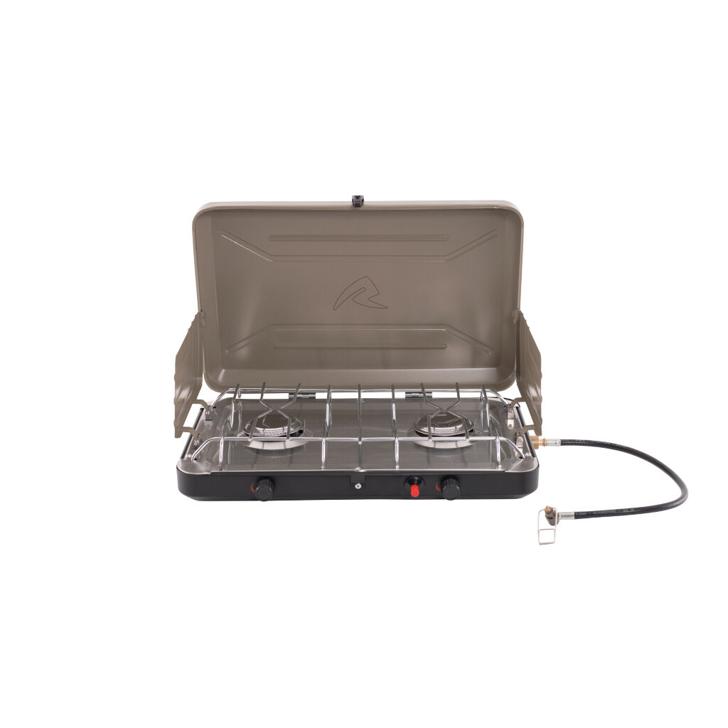 Kraftig campingspiser for engangsflasker. Spisen har to brennere i rustfritt stål samt innebygd vindskjerm som også brukes som lokk ved transport. Avtagbart gitter for brennerne gir enkel rengjøring. Begge brennerne tennes med den innebygde piezo-tenningen.