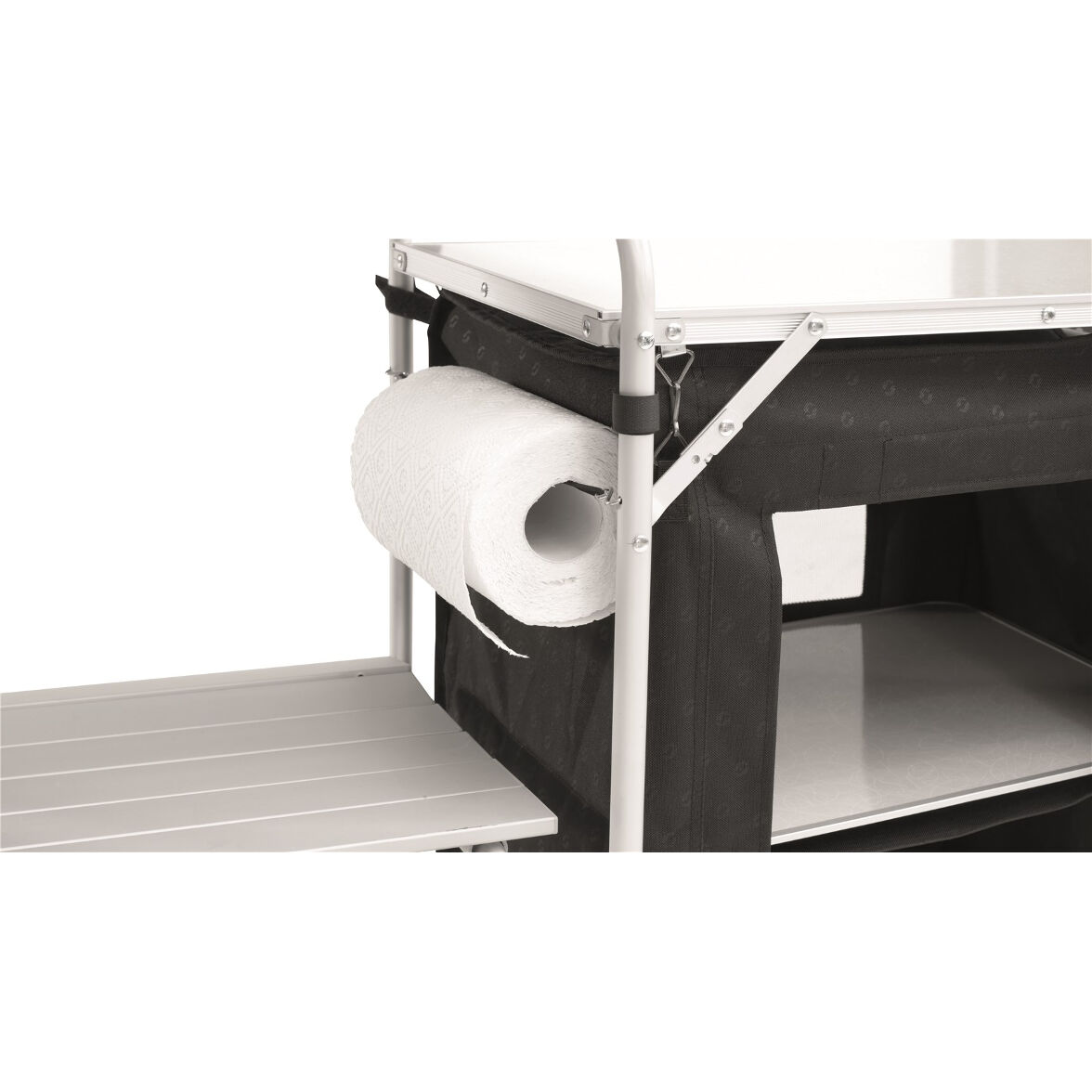 Kjøkkenbenk for camping med god plass for komfyr samt med to store avlastningsflater på sidene. To skap med to hyller og magnetlukkede dører samt et åpent hyllplan gir bra med plass for både gass, tørrvarer og kjøkkenutstyr.