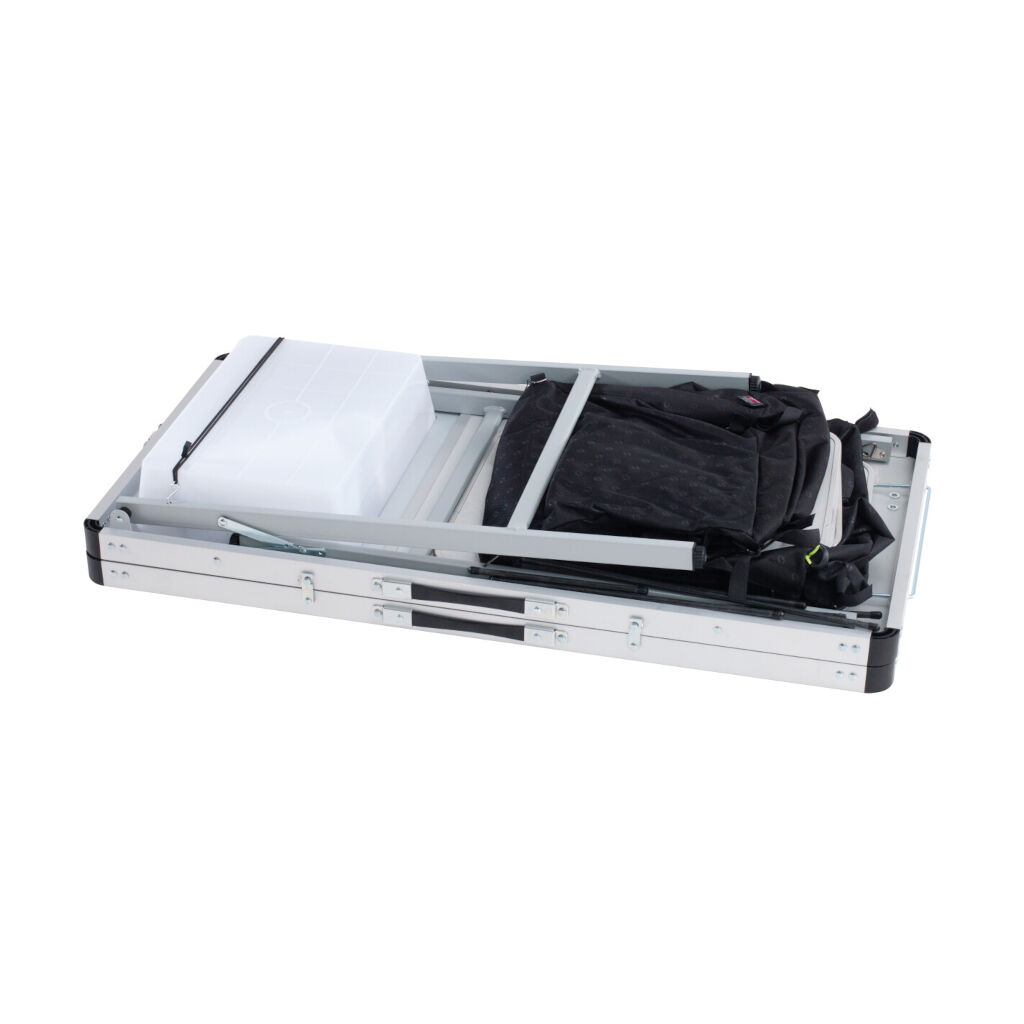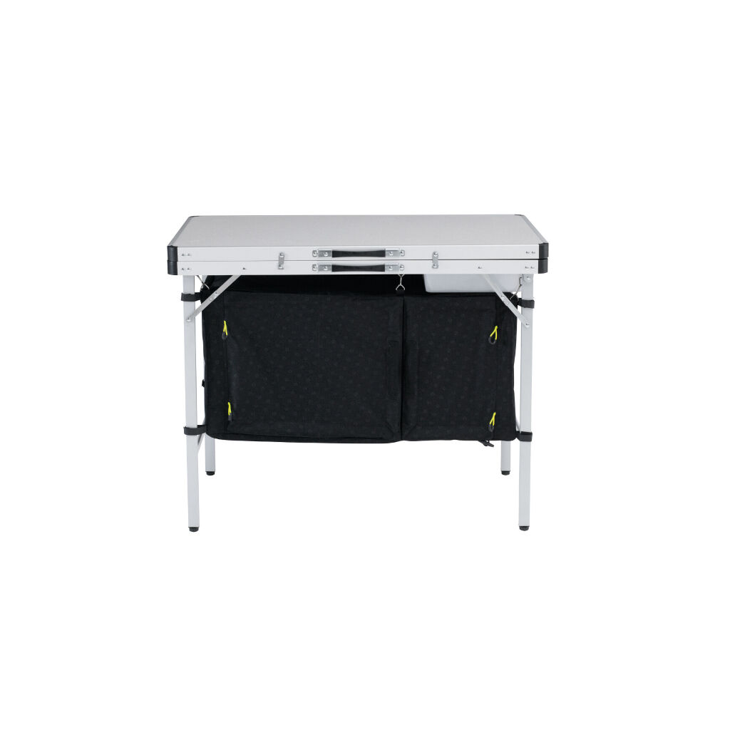 Kjøkkenbenk for campingen med en vindbeskyttet benk med plass for kokeapparat samt en avtagbar oppvaskbalje. Godt med lagringsplass med netthyller, kroker, to skap som gir bra med plass for mat, utstyr samt gassflasken. Skapene er like lett tilgjengelige som vanlige kjøkkenskap takket være magnetfester på dørene.