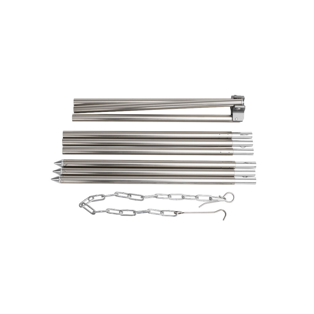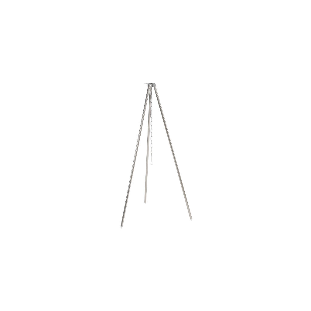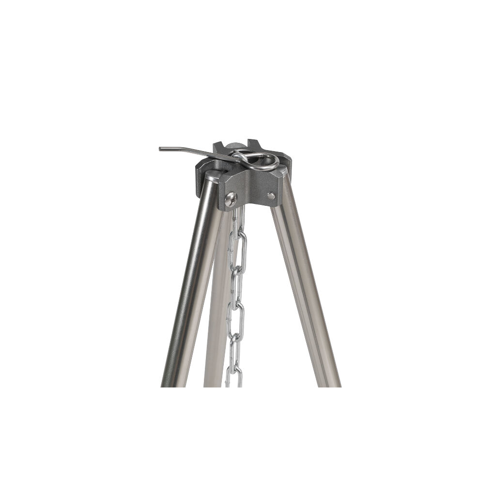 Stativ for matlaging over åpen ild. Bena monteres enkelt med et klikk-låsesystem og har spisse ender for stabilitet. Juster lengden på kjeden for å endre avstanden til bålet. Kjede og krok for oppheng av gryte over bålet er inkludert.