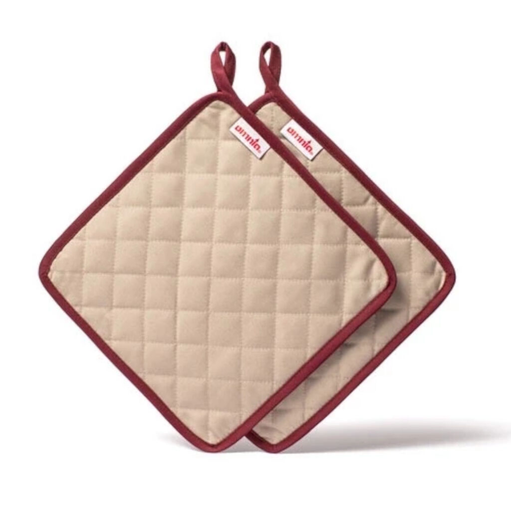 Beige grytekluter (24x24 cm) med vinrødt kant, 65% polyester, 35% bomull, perfekte for Omnia-produkter.