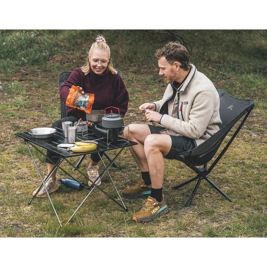 Sammenleggbart lavt bord med liten pakkestørrelse for to til fire personer. Perfekt for små telt, dagsturer, stranden eller piknik, da det også fungerer godt å sitte på bakken og spise ved bordet. Enkelt å montere.