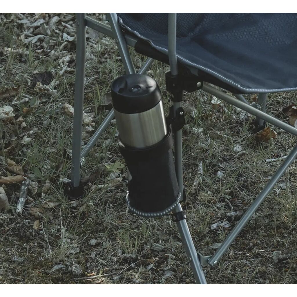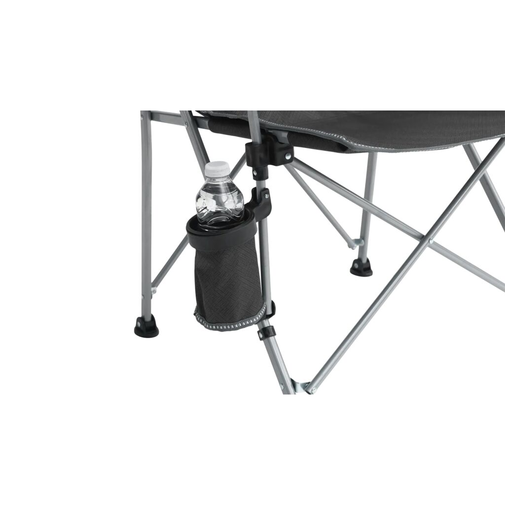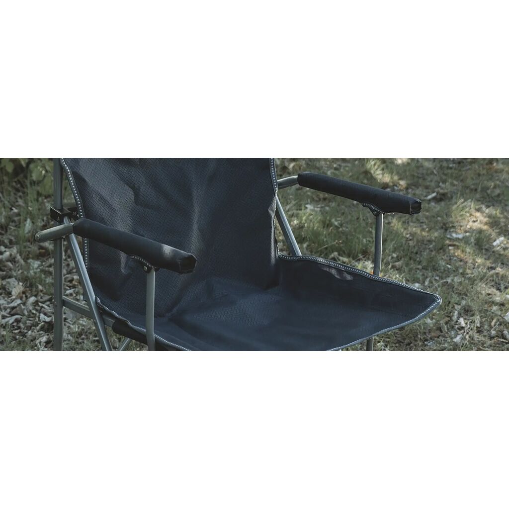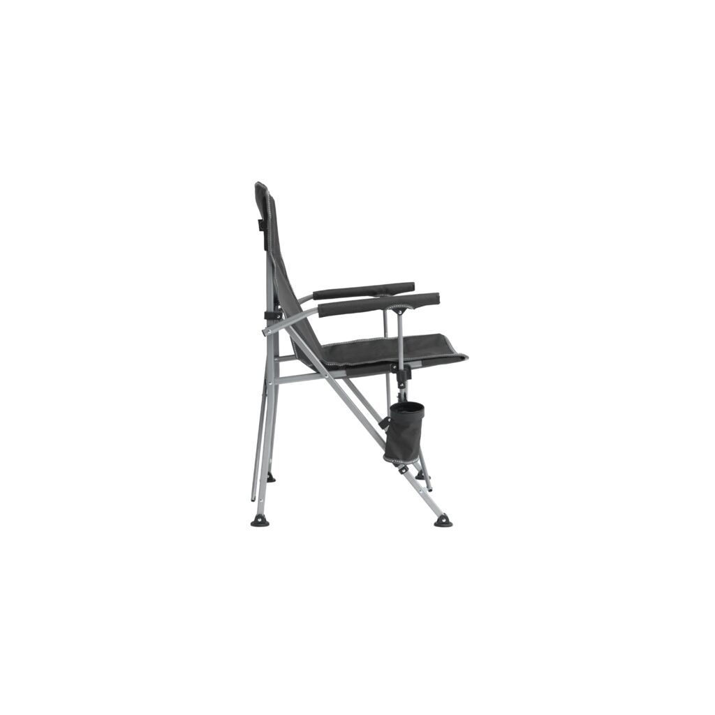 Pakkevennlig campingstol med robust stålramme, polstrede armlener og koppholder. Tåler opptil 110 kg.