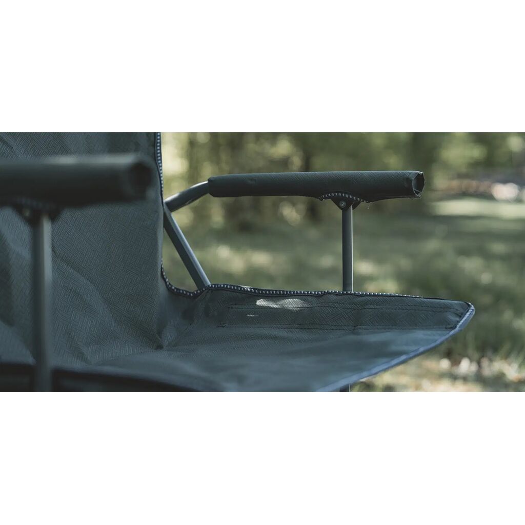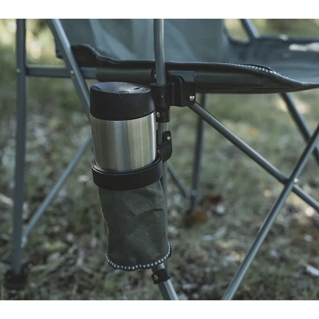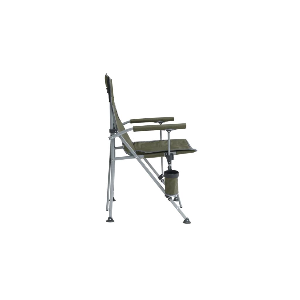 Pakkevennlig campingstol med robust stålramme, polstrede armlener og koppholder. Tåler opptil 110 kg.
