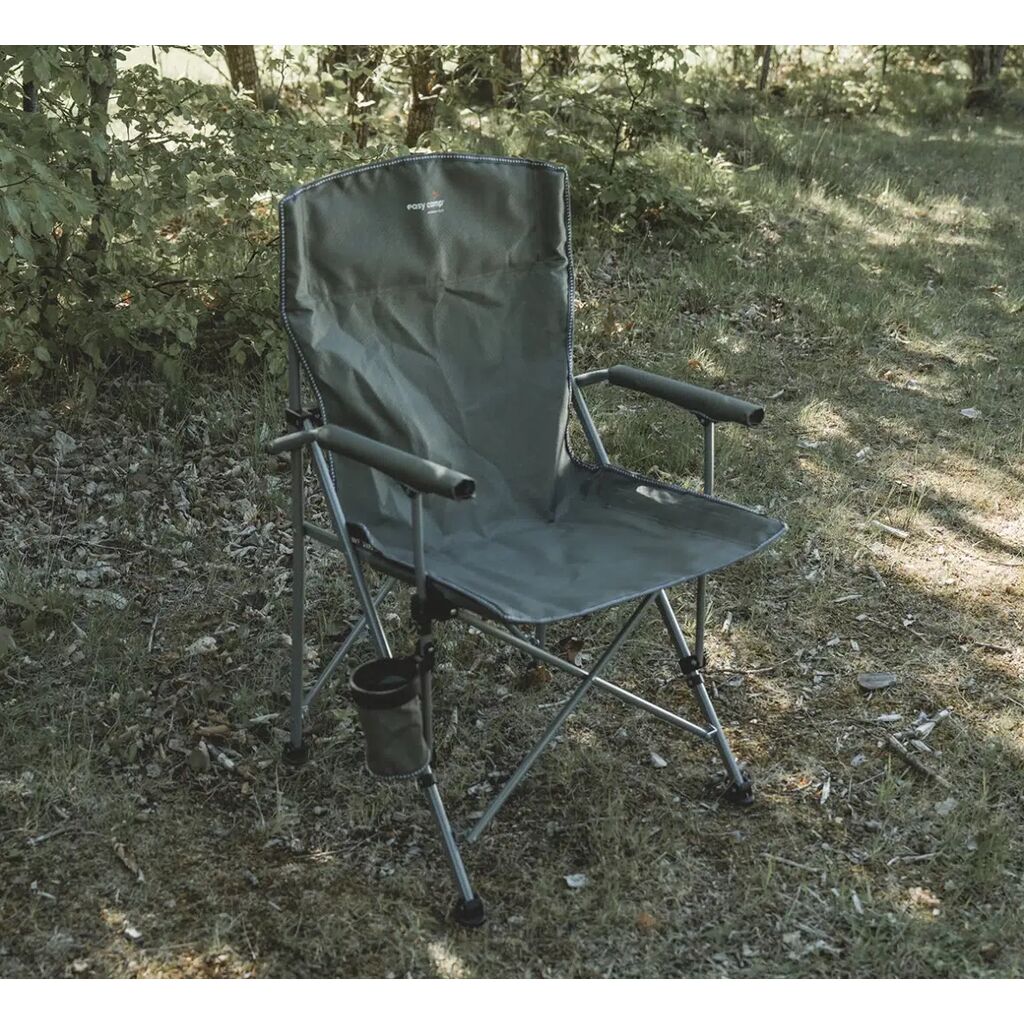 Easy Camp Oak er en pakkevennlig campingstol med robust stålramme, polstrede armlener og koppholder. Tåler opptil 110 kg.