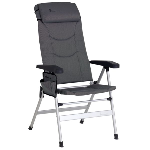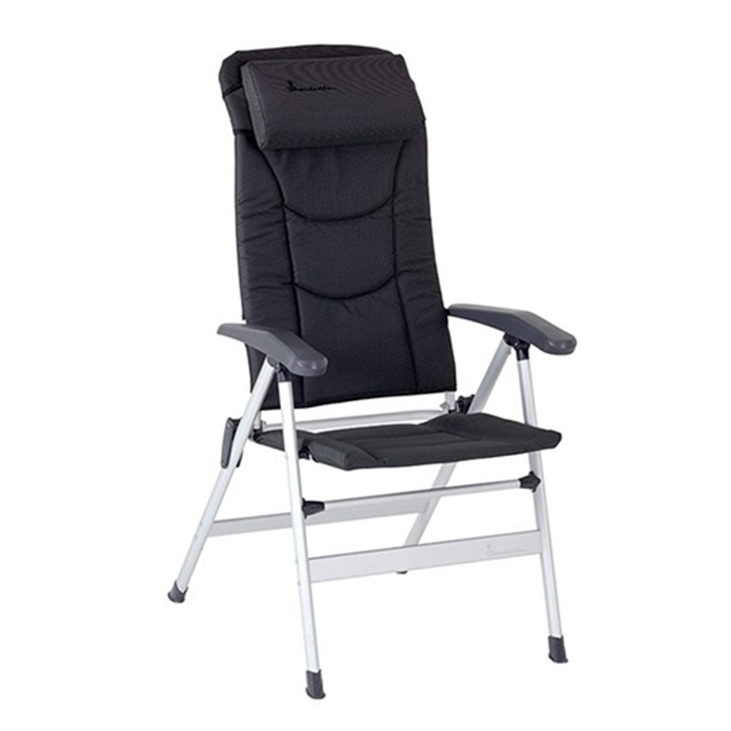 Samlebar campingstol med en stor nakkestøtte samt et høyt ryggstøtte med åtte posisjoner. Stoff i en myk Polyweave tekstil (60% PVC Coating/40% Polyester) som er svært slitesterk mot både slitasje og UV-lys. Med andre ord en stol for dere som camper mye.