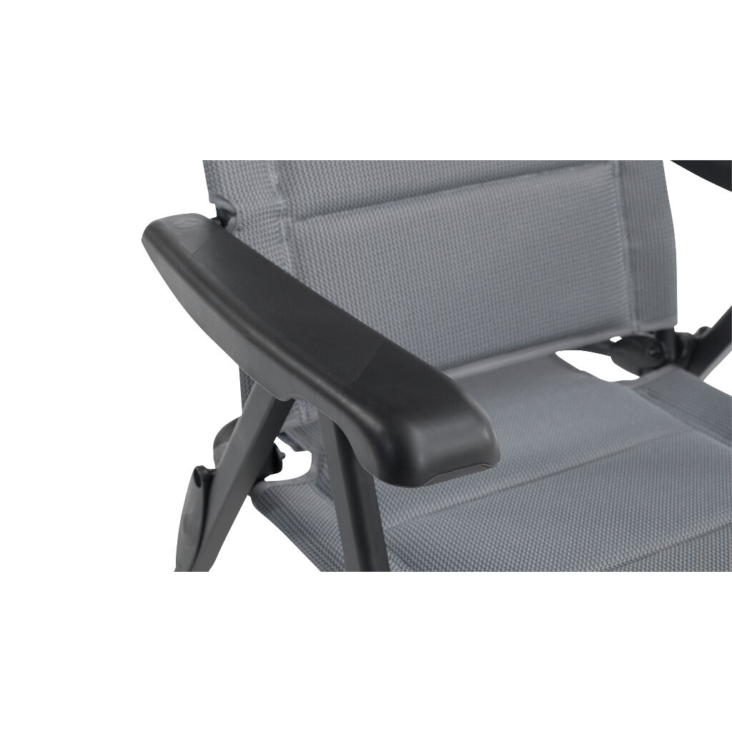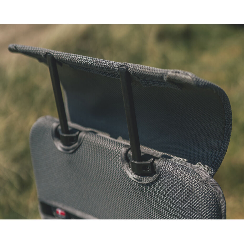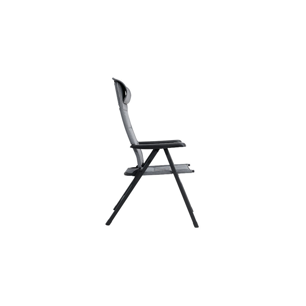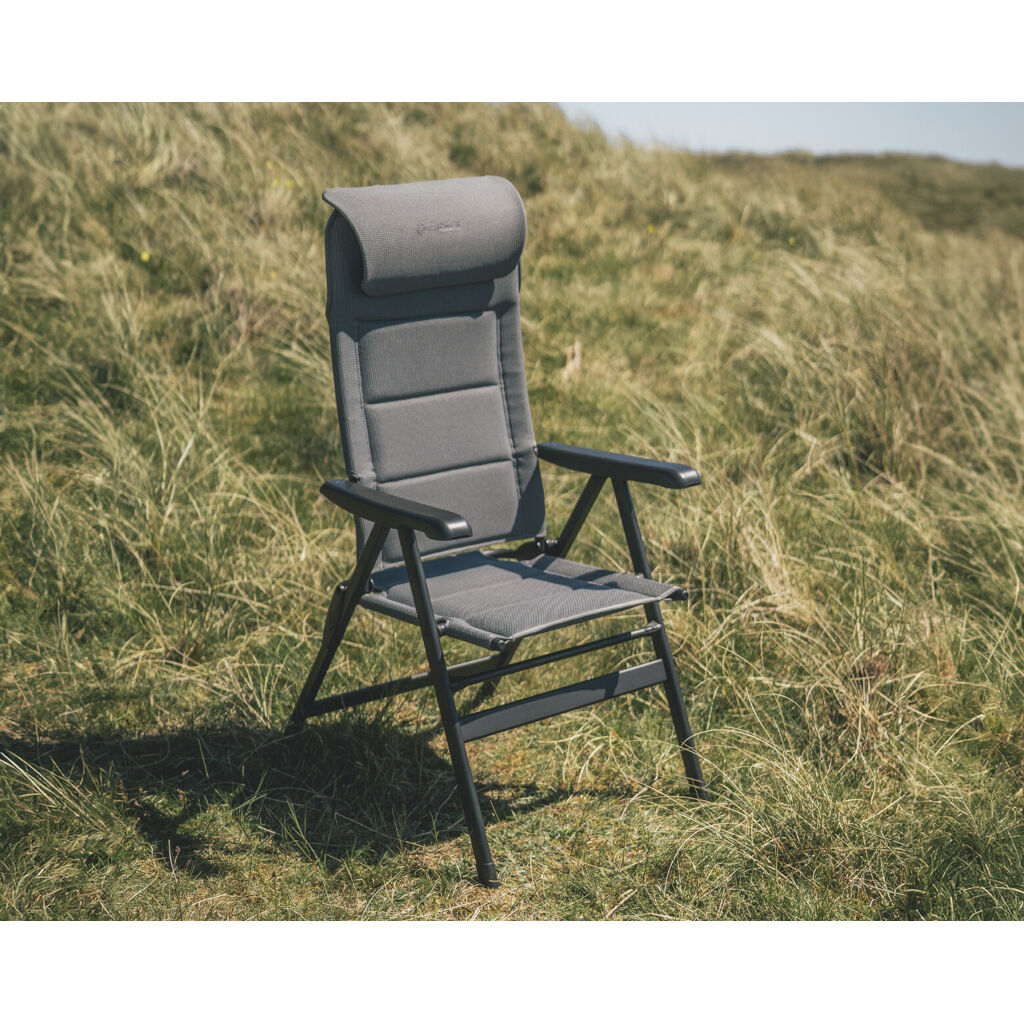 Campingstol med høyt ryggstøtte og hurtigttørkende polstring, nakkestøtte og syv posisjoner på ryggstøtten. Polstringen gir en betydelig bedre komfort enn du får på vanlige campingstoler. Takket være et vannavvisende materiale under stoffet som forhindrer skumpolstringen fra å suge opp vann, gjør det ingenting om stolen blir stående ute i regnet. Bare 15 cm høy i sammenfoldet tilstand gjør den virkelig pakkvennlig.
