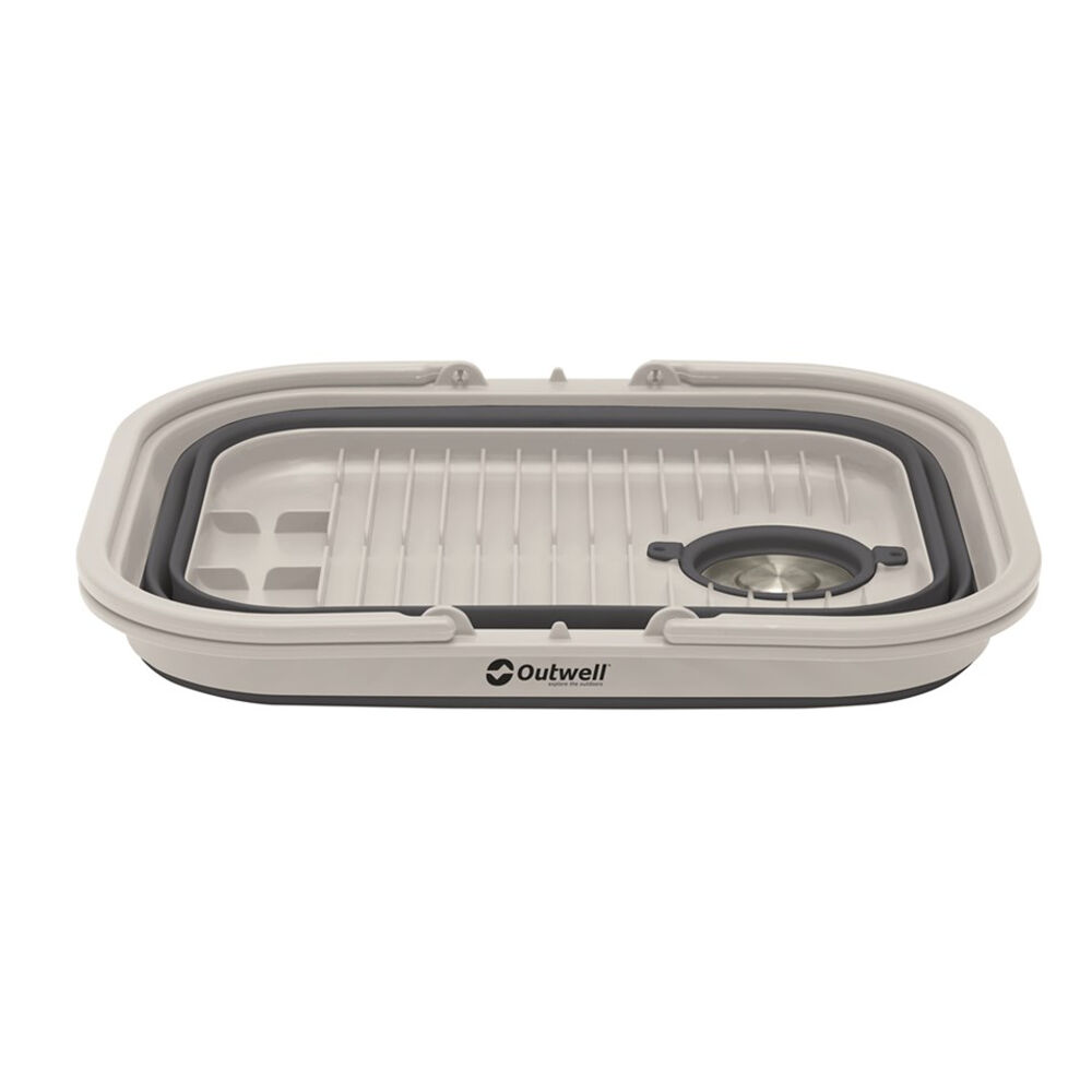 Smart sammenleggbar oppvaskkum med innebygd avløp med propp samt med lokk og håndtak. En smart funksjon er en innebygd tallerkenholder som letter tørkingen av oppvasken. Man kan flytte oppvasken, vaske samt også tørke oppvasken i oppvaskkummen. Når den ikke brukes kan den trykkes sammen og blir da kun 6 cm høy. Perfekt for alle campere.
