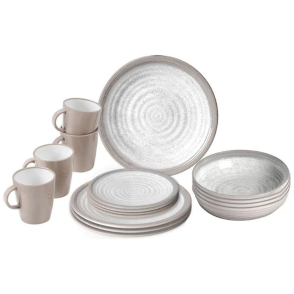 Servise for fire personer i solid melamin med en overflate som minner om steintøy. Lett og slitesterk gjør at den passer veldig godt for camping.