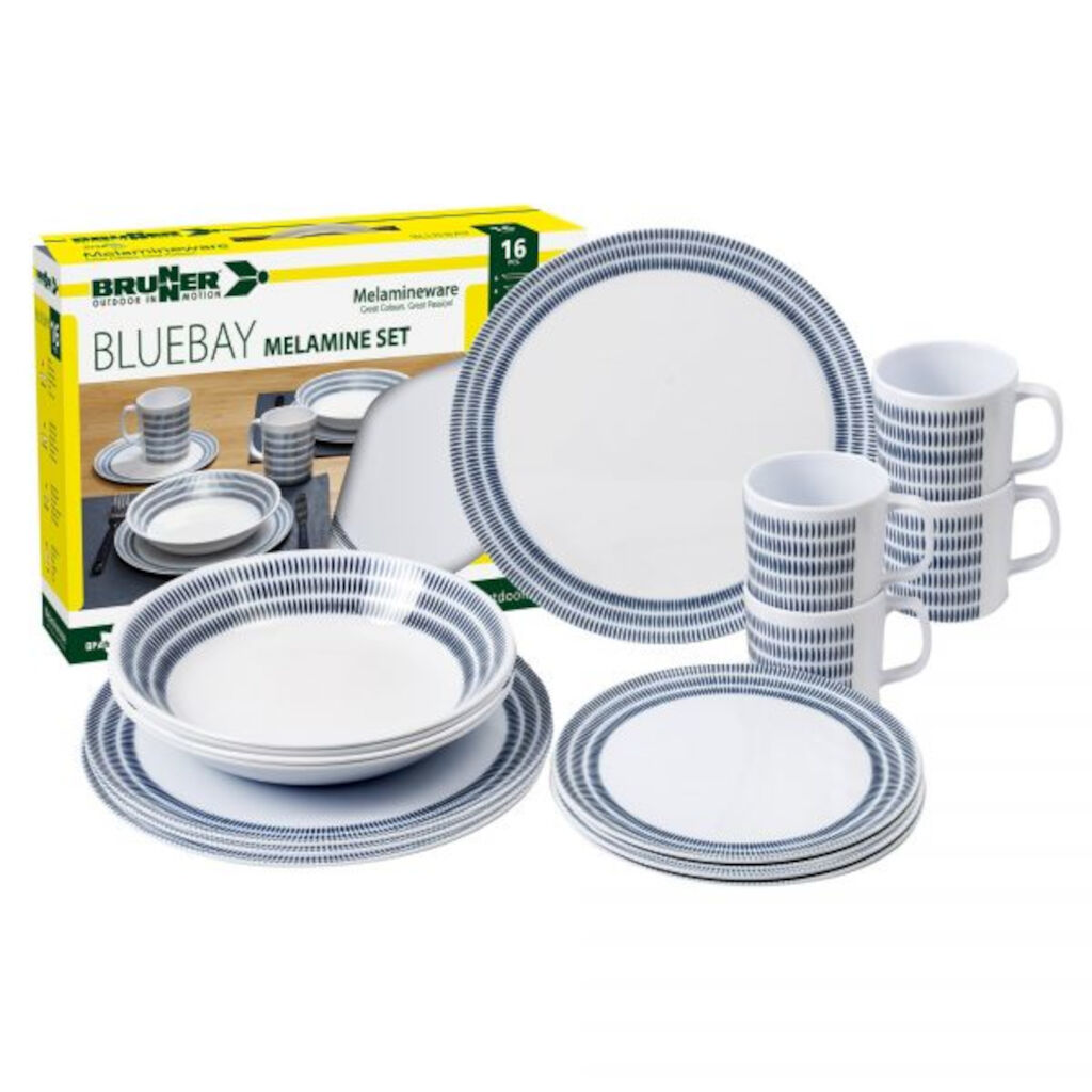 LES MERVakker servise for fire personer i Melamin. Melaminet er perfekt for camping da det er lett, bruddsikkert og enkelt å rengjøre. Alle deler tåler oppvaskmaskin.