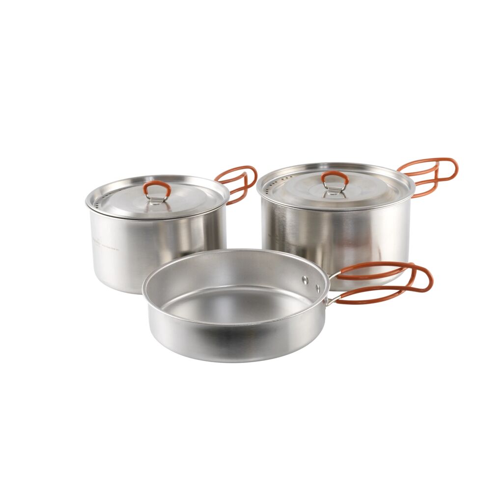 Stabelbart kokesett i rustfritt stål fra Easy Camp, bestående av to kasseroller (2 og 3 liter) med lokk samt en stekepanne. Kasserollene og stekepannen har non-stick-belegg og håndtak i rustfritt stål trukket med silikon.