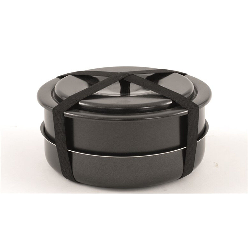 To gryter på 1,5 respektive 1 liter med et lokk som passer begge samt en stekepanne og en kaffekanne. Alt i aluminium med slitesterk non-stick behandling. Settets pakkes sammen i hverandre og deretter i den medfølgende pakkeposen.