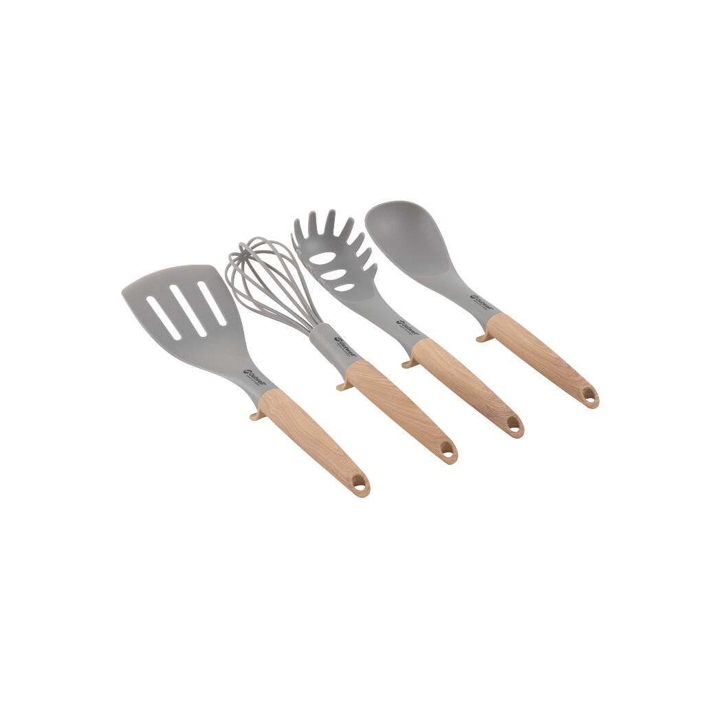 Kjøkkenutstyr for camping. I settet inngår det en pastasleiv, visp, stekespade og serveringsskje. Redskapene kan enkelt oppbevares i medfølgende nettpose.