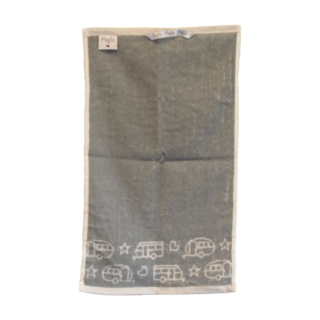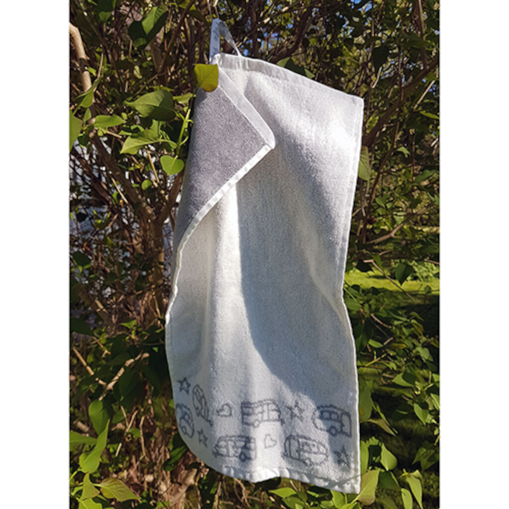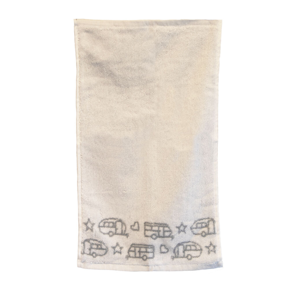 Håndkle med campingvogn- / bobilmotiv. Laget av 100% bomullsfrotté med god oppsugingsevne.