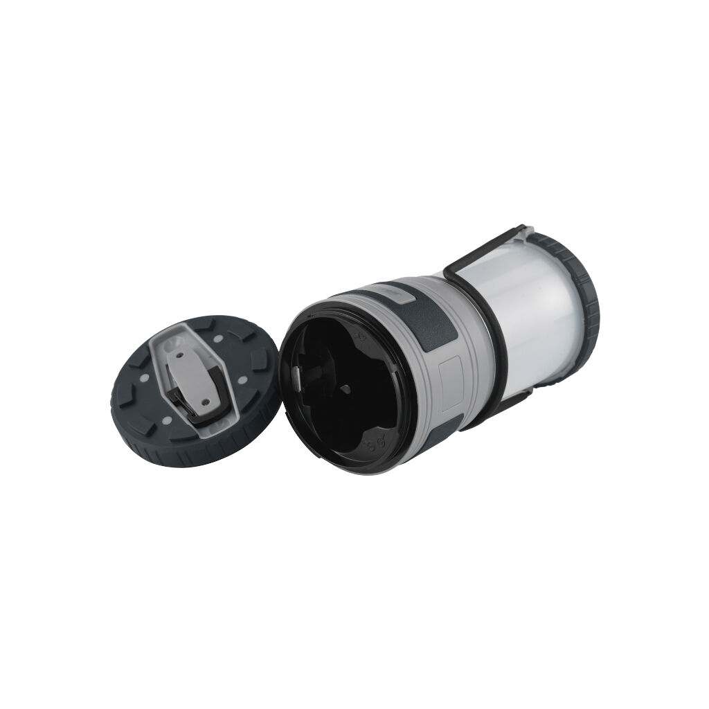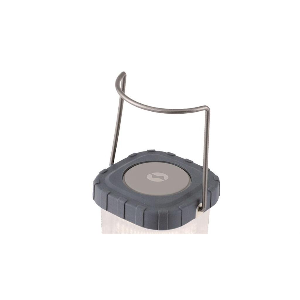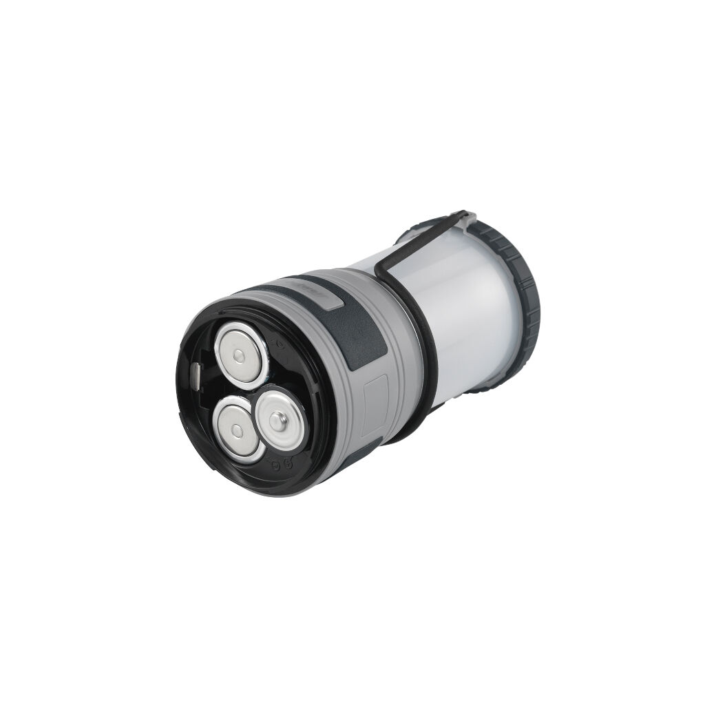 Lyssterk campinglykt med bærehåndtak. Med krok i bunnen og avtakbar topp kan den brukes som taklampe i teltet. Drives av 3 x AA-batterier (ikke inkludert).