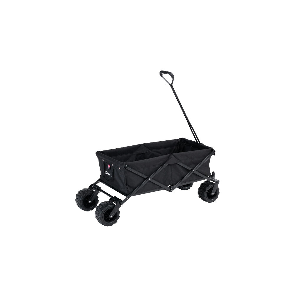 Transportvogn med lengre håndtak og ekstra store hjul. De brede dekkene gjør at den også fungerer på sand. Perfekt for campingutstyret, for strandbesøket eller for å gi barna en hvilestund på turen. Felles enkelt sammen for transport og oppbevaring.