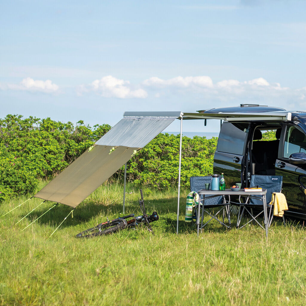 Outwell Hillcrest Tarp er et fleksibelt solskjerm som gir beskyttelse, skygge og privatliv. Det monteres enkelt på fronten av markisen og kan tilpasses med stenger eller ekstra sidepaneler for ekstra beskyttelse.