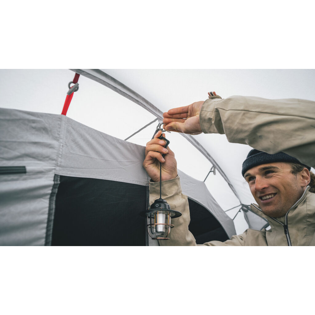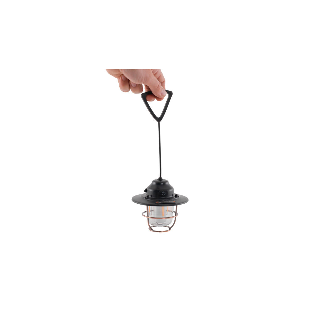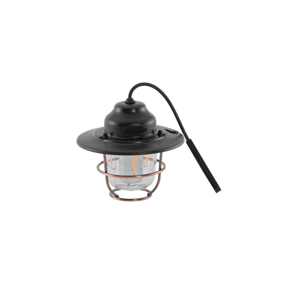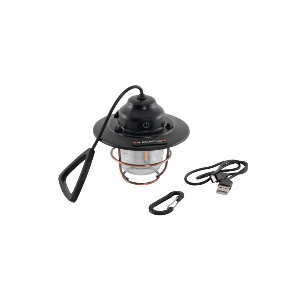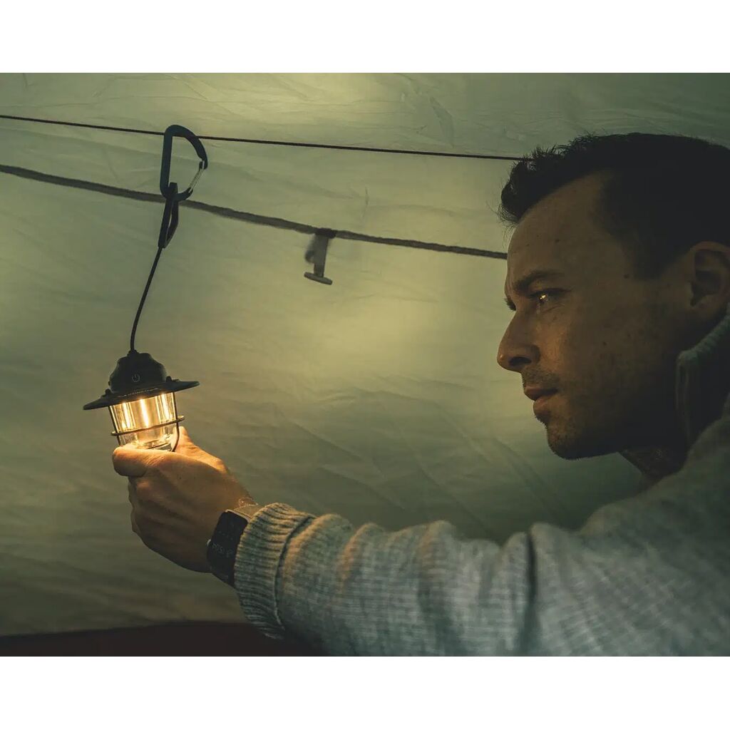 Kompakt og praktisk campinglampe i klassisk design med moderne funksjoner. Lampen har oppladbart batteri, dimmerfunksjon og flere fargeinnstillinger. Leveres med karabinkrok for enkel opphenging og ladekabel (USB-C).