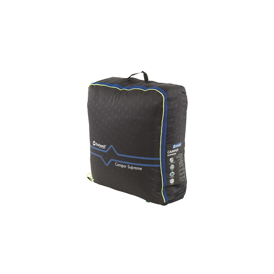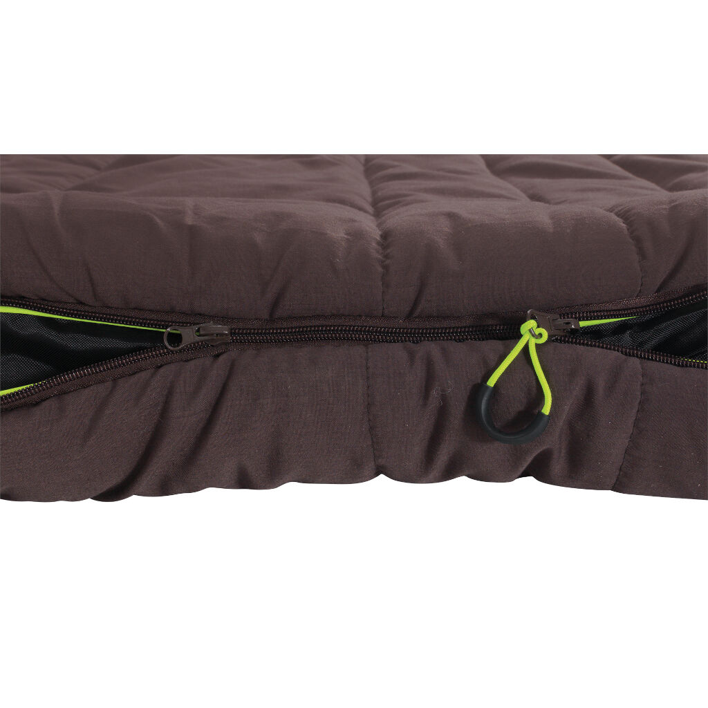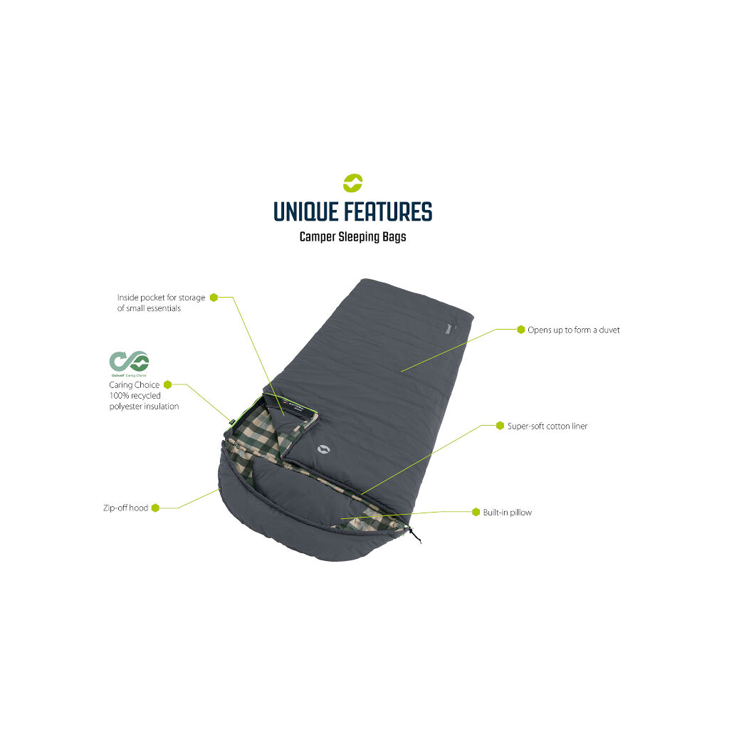Den varmeste soveposen i premiumserien Outwell Camper er laget for de som ønsker en ekstra varm og komfortabel sovepose, eller for de som camper i de kaldere årstidene. Et robust tolags fyll reduserer risikoen for kalde områder, og hvis det blir for varmt, kan du åpne den i fotenden for ventilasjon eller bruke den som et vanlig teppe. Takket være et mykt bomullsfôr på innsiden gir den en betydelig bedre følelse enn vanlige soveposer. Glidelåsen er beskyttet med en overlappende kant med fylling for å hindre varmetap.