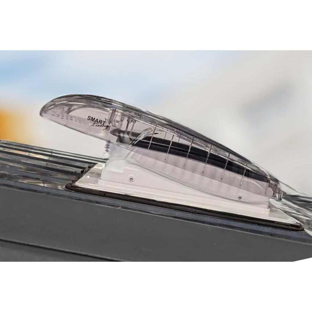 Elektrisk takventilasjon med 10 forskjellige innstillinger, termostatstyring, LED-belysning, mørkleggingsgardin samt en fjernkontroll som kan styre vifte og belysning (kan også justeres manuelt via takluke kontrollpanelet). Enkel installasjon da viften passer standard takåpning (40 x 40 cm). Termostatstyringen gjør det enkelt å opprettholde en jevn temperatur uten å måtte justere luken selv. En stor fordel med Smart Livings løsning er at den også har innebygd mørkleggingsgardin og to innebygde LED-lister med en behagelig fargetemperatur. Viftemotoren er reversibel slik at man kan både blåse inn og ut luft fra campingvognen eller bobilen.