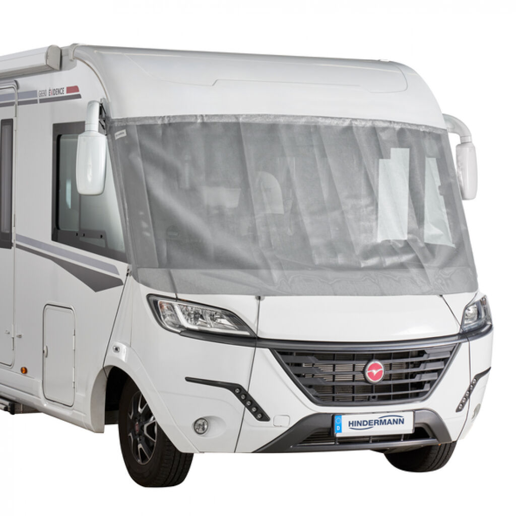 Universalsolsbeskyttelse fra tyske Hindermann som er et helintegrert solbeskyttelse som festes på bobilens utside. Solbeskyttelsen holder solens stråler ute samtidig som man fortsatt kan se ut fra bobilens innside. Dekker frontruten.