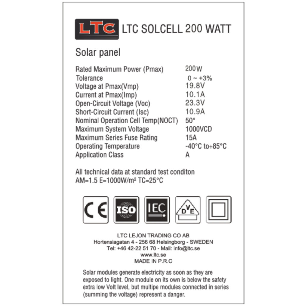 200W solpanel fra Svenska LTC. Takket være effektive 5bb celler har panelet en høyere effekt på mindre flate. Utviklet for å tåle klimaet i Norden og har derfor et temperaturområde på -25°C til +80°C.