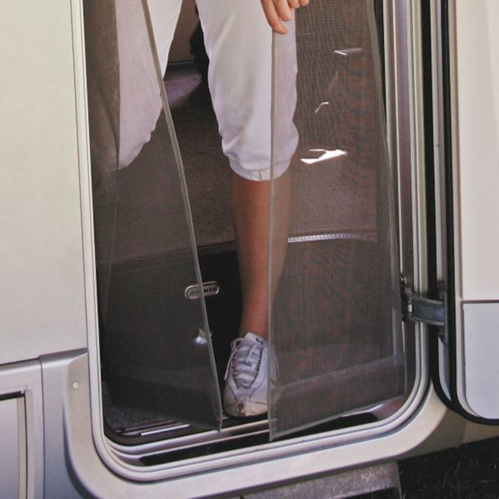 Myggenettforheng med to overlappende deler hvor nedre del er forsterket for å holde forhenget i form. Effektiv produkt som stopper småkryp fra å komme inn i campingvognen eller bobilen når man ønsker å lufte eller beholde utsikten.