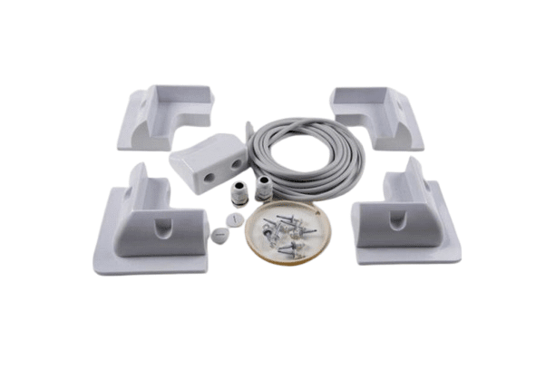 | Detta ingår | 4 x Plasthörn - vita, Skruvsats inklusive gummilist, Vattentät kabelgenomföring, 5 meter kabel, Monteringsanvisning |