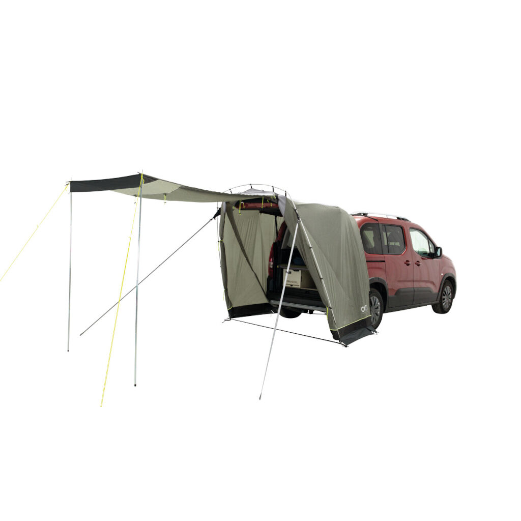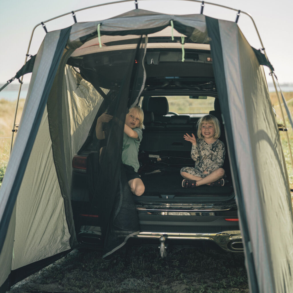 - Kjøretøyets bakluke kan åpnes inne i forteltet når det er montert
