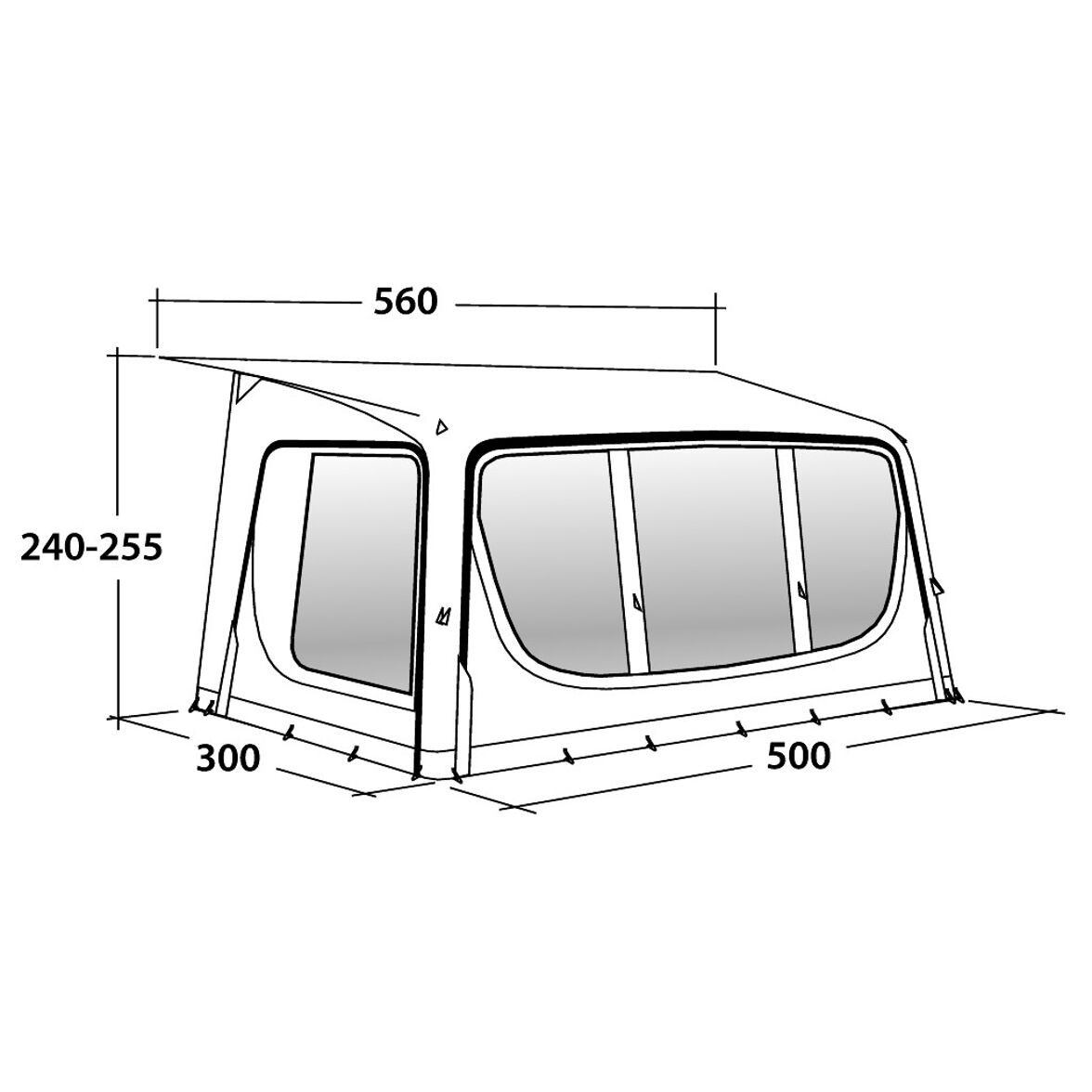 Outwell Tide 500SA är ett förtält som är inte bara är mycket rymligt och lätt att resa utan även bjuder på en riktigt hög komfort. Med en bredd på 500 cm, ett djup på 3 meter samt de bockade luftkanalerna som ger en bra takhöljd i hela tältet finns det gott om plats för möbler utan att förtältet blir trångbott. Att det har dörrar från båda sidor ger ytterligare frihet att möblera och ändå hålla husvagnen lättillgänglig. Vill man sedan öppna upp tältet mer går både de tre frotnsektionerna och sidosektionerna öppna upp. Både dörrarna, sidosektionerna samt fronten har myggnät vilket ger en riktigt bra ventilation utan att man får in småkryp i rummet. Det ingår även ett dragskydd som monteras mot husvagnen för att förhindra vind och småkryp från att komma under husvagnen. Dragskyddet har även en förvaringsficka.