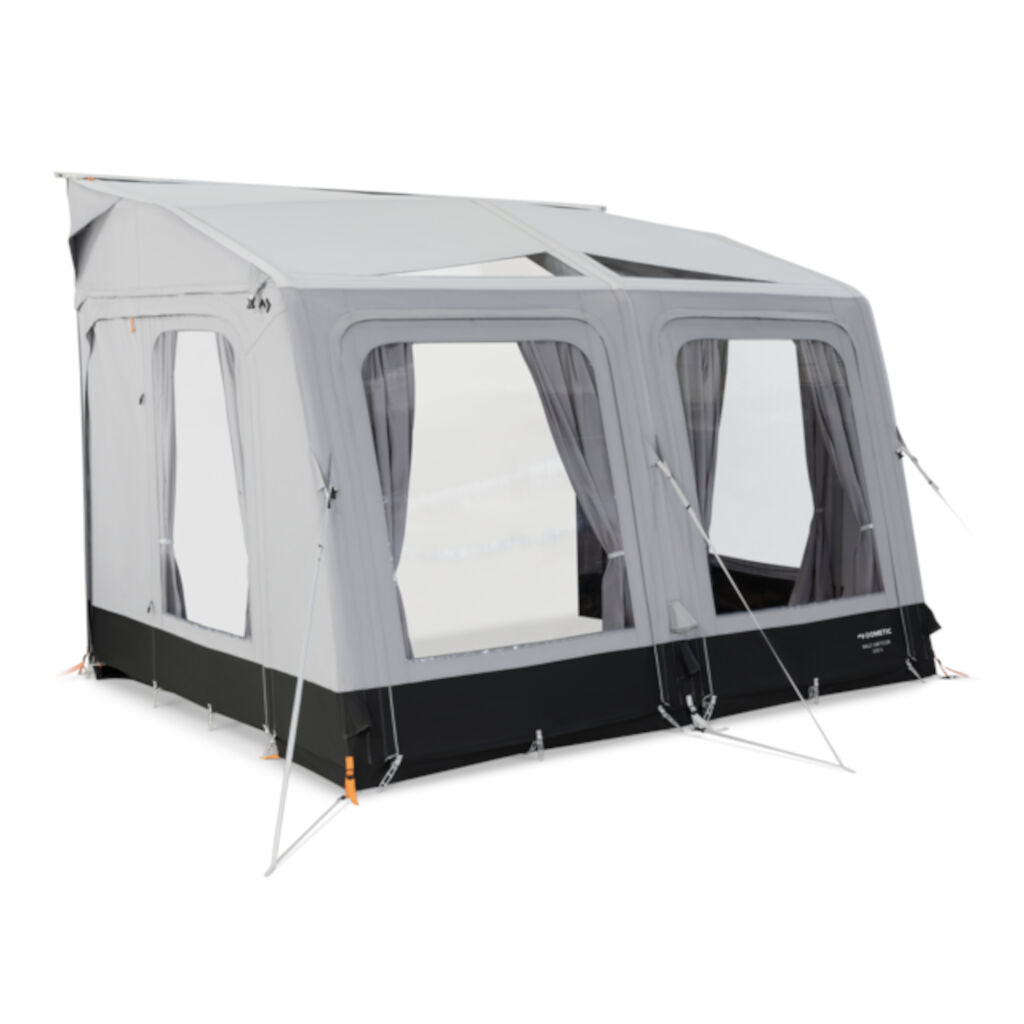 Dometics Rallt Air Pro S er et lett og fleksibelt fortelt med luftkanaler. Teltet er ekstremt enkelt å montere og reise, og kan takket være doble kederlister monteres på både campingvogn og lave bobiler. Fest bare teltduken i listen på campingvognens markise, sett fire teltplugger i hjørnene og pump opp de i teltduken integrerte kanalene som danner rammen fra en ventil på teltet. Fest deretter tetningen mot campingvognen, og teltet er klart for innflytting. Store vinduspaneler rundt teltet og i taket gir godt lys og en virkelig flott utsikt. Både front- og sidepanelene kan åpnes på varme dager.