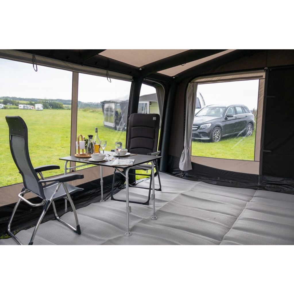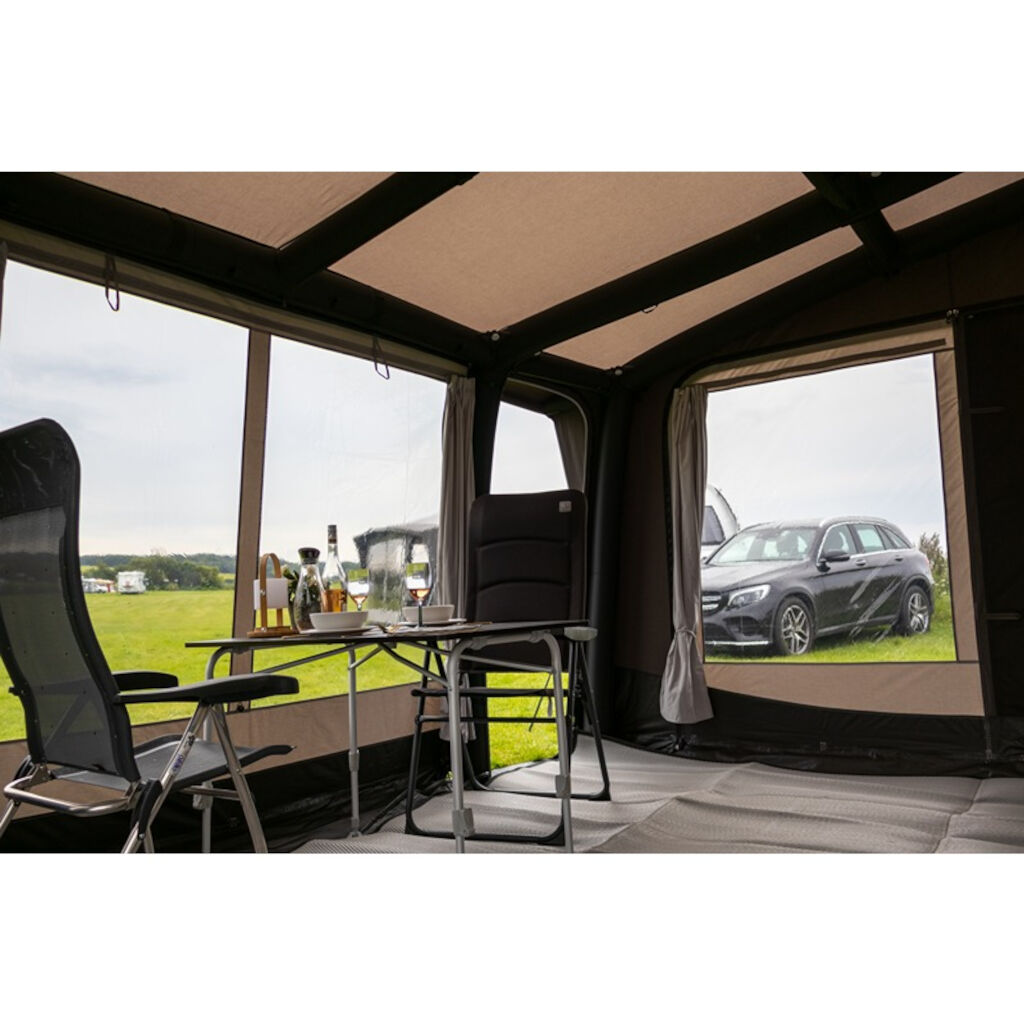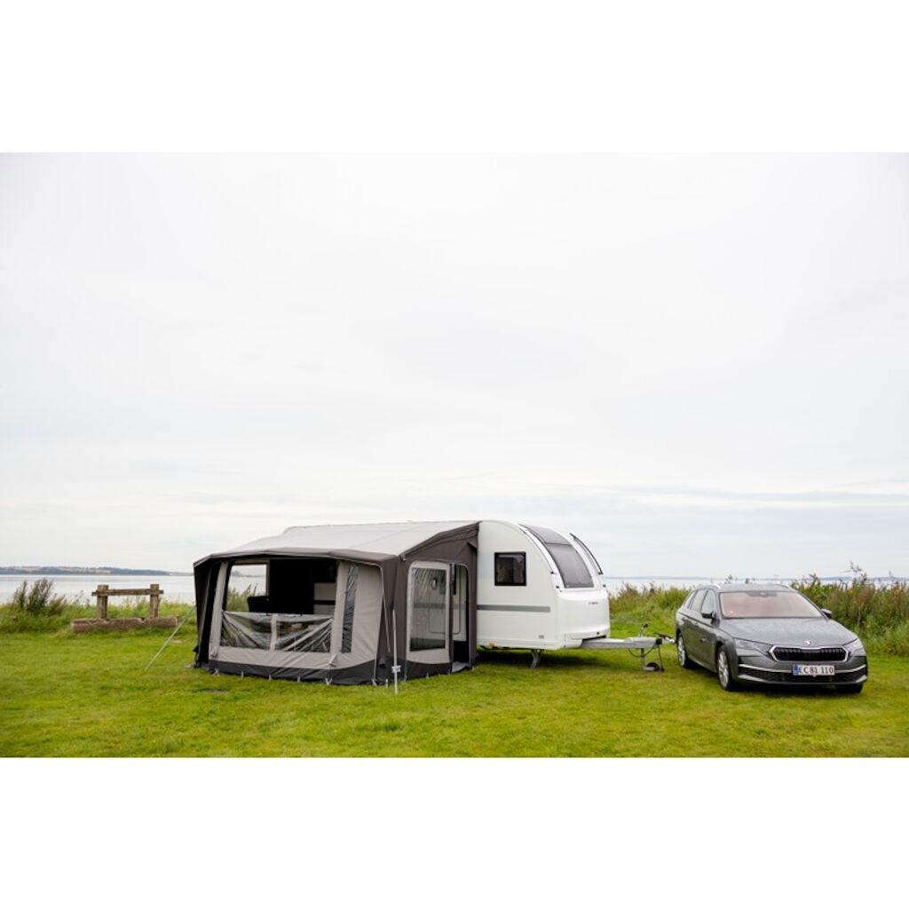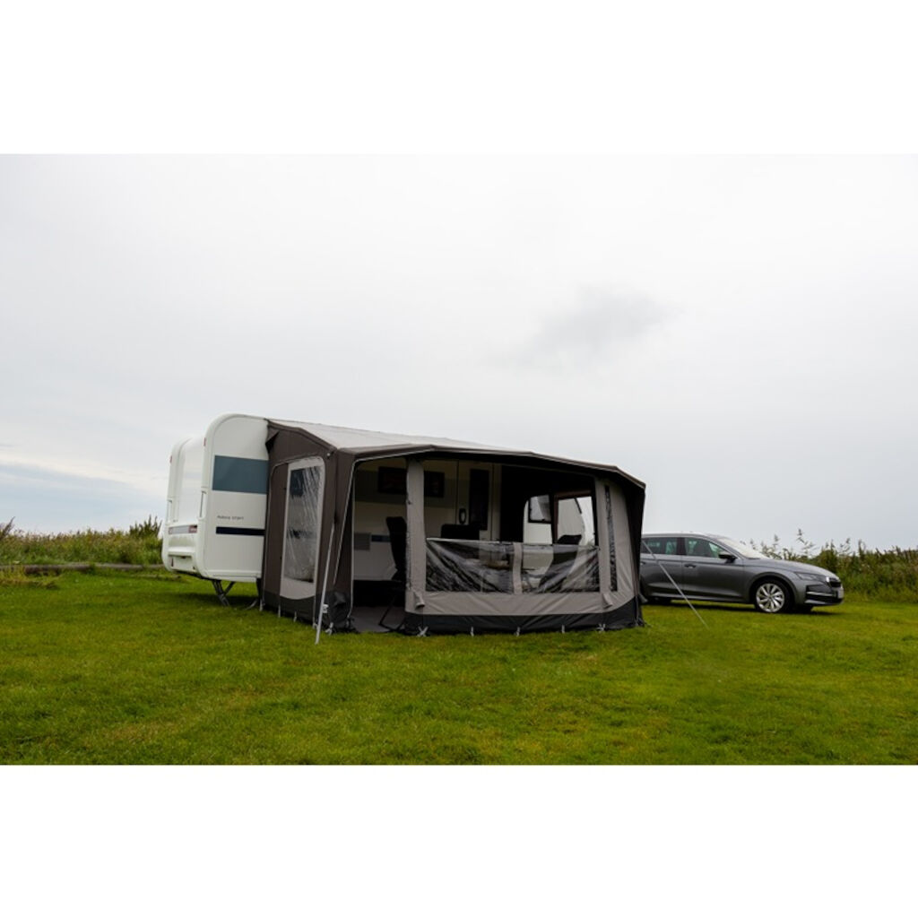 Telta Scenic 390 er et romslig og hyggelig fortelt med en dybde på 300 cm og store åpningsbare vinduspaneler. De store vinduene foran på teltet gir både et behagelig lys og en følelse av rom i teltet. Hvis du vil redusere innsyn, kan gardinene trekkes for. Teltet er raskt å sette opp, og dets robuste, pustende stoff reduserer kondens og gir et kjøligere klima på varme dager. Perfekt for deg som camper ofte eller reiser sørover om sommeren. Teltet er enkelt å montere og sette opp, og takket være doble kederlister kan det monteres både på campingvogn og bobil. Fest bare teltduken til skinnen på campingvognen eller markiseskinnen på bobilen, sett fire plugger i hjørnene og pump opp de integrerte kanalene i duken som danner rammen fra en ventil på teltet. Fest deretter tetningen mot campingvognen, og teltet er klart til bruk.