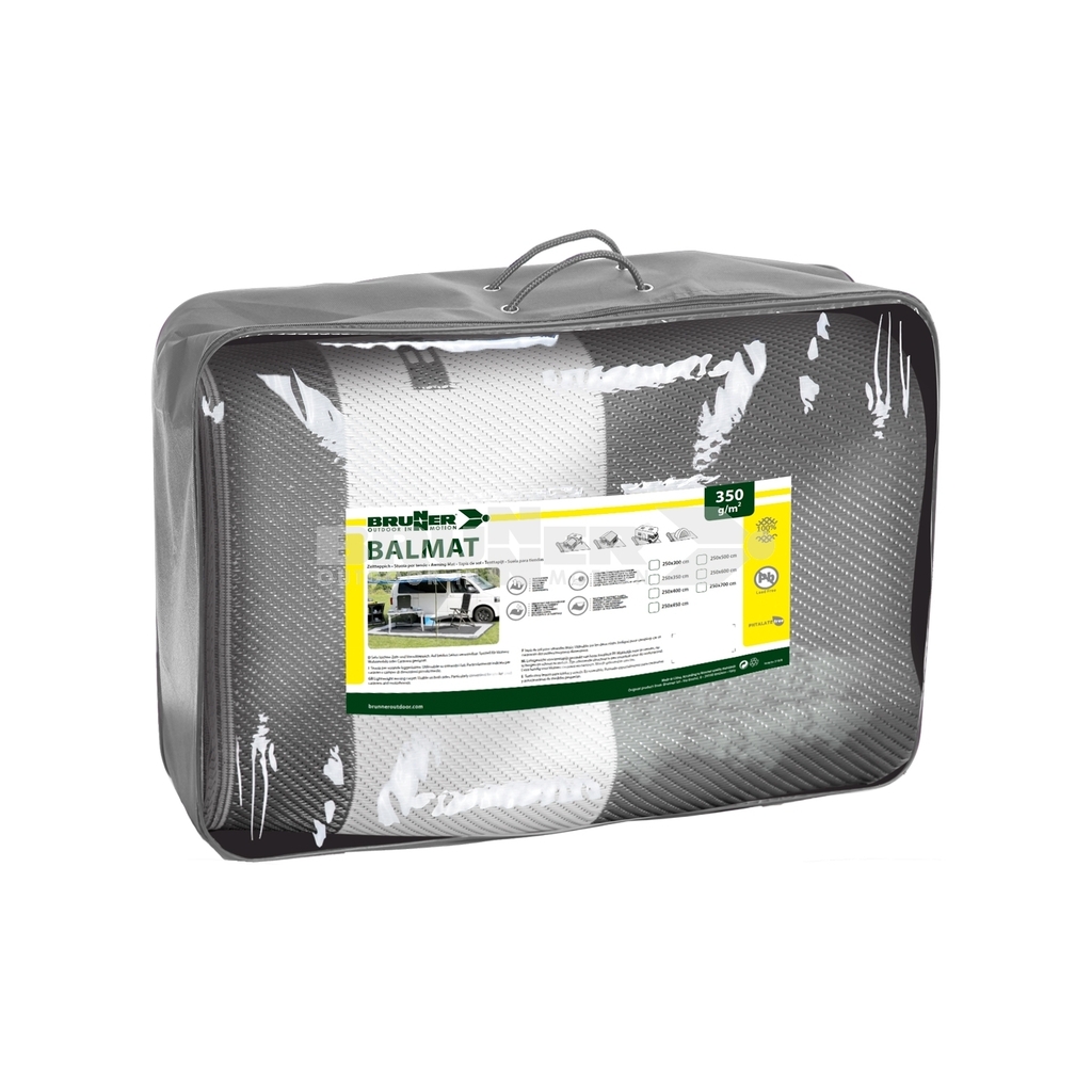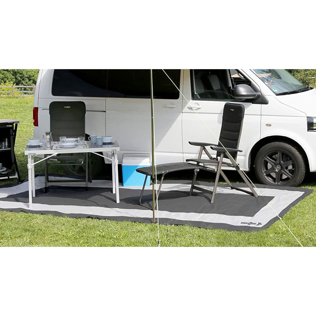 Letvægtsmåtte til campingvogns- og autocampermarkiser med beslag i hjørnerne. Kan bruges på begge sider. Åndbar og UV-bestandig. Let at transportere i den medfølgende taske.