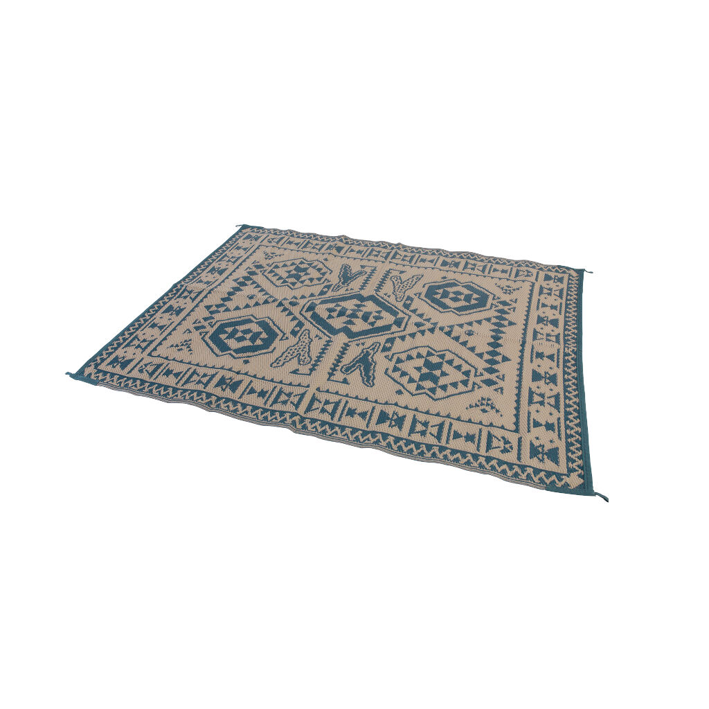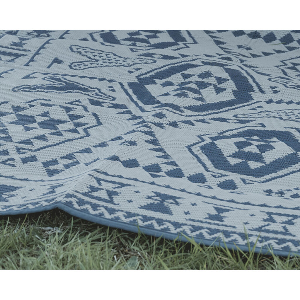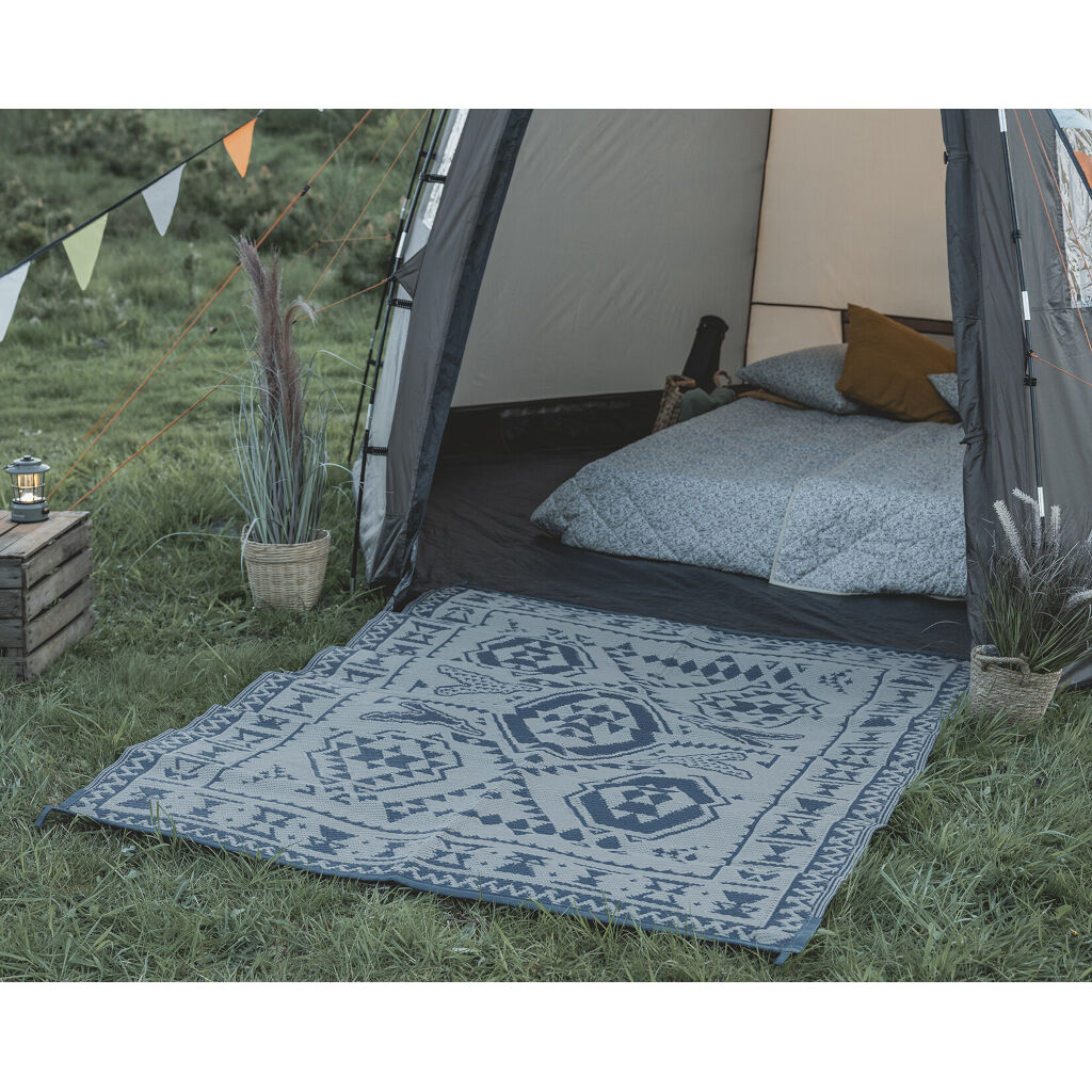 Mønstret teppe i slitesterkt materiale som er lett å rengjøre og gir en lun følelse til teltet eller uteplassen.