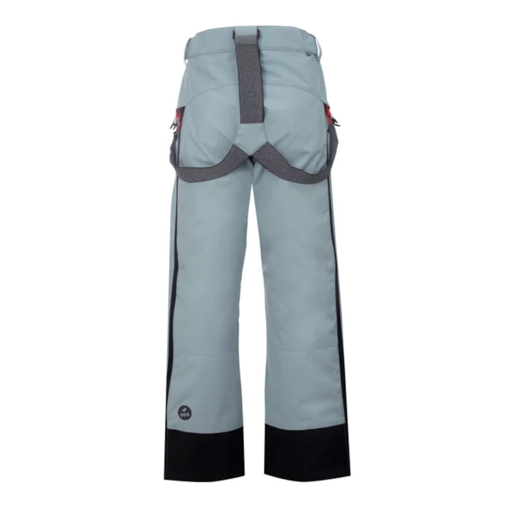 Vind- og vanntett skibukse laget av resirkulert stretchmateriale. Justerbar midje, avtagbare seler, snølås og glidelås langs hele sidene for optimal passform og tilpasset både snølek og skikjøring.
