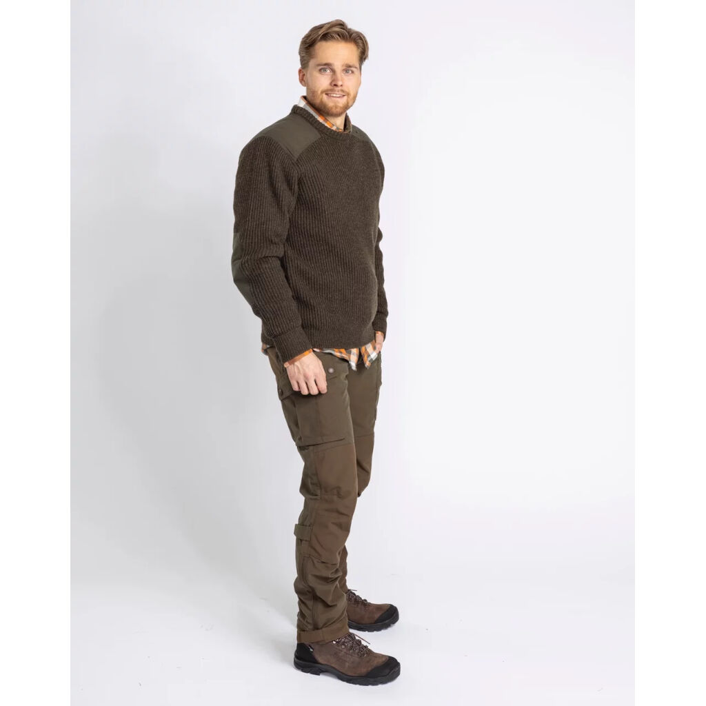 Strikket ullgenser i melert mosegrønn farge med forsterkninger på skuldre og albuer. Genseren er laget av 100% merinoull, noe som gjør den både slitesterk og transporterer bort fukt fra kroppen og holder deg tørr. Skuldre og albuer er forsterket med rip-stop stoff for ekstra holdbarhet.
