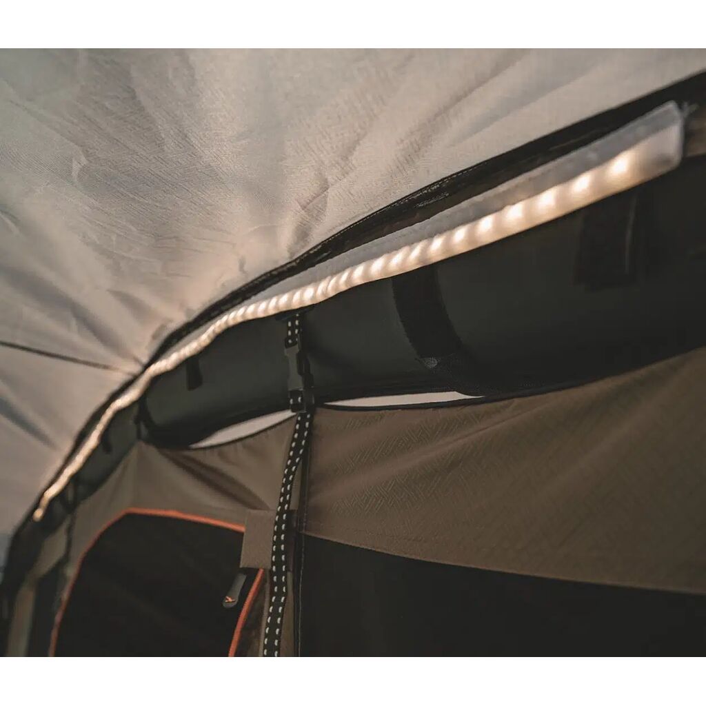 En 150 cm lang, dimbar LED-lyslenke med USB-C-tilkobling. Kan enkelt festes i utvalgte Easy Camp-telt og drive-away-fortelt med integrerte borrelåsfester, eller i andre telt ved hjelp av de medfølgende festelappene.