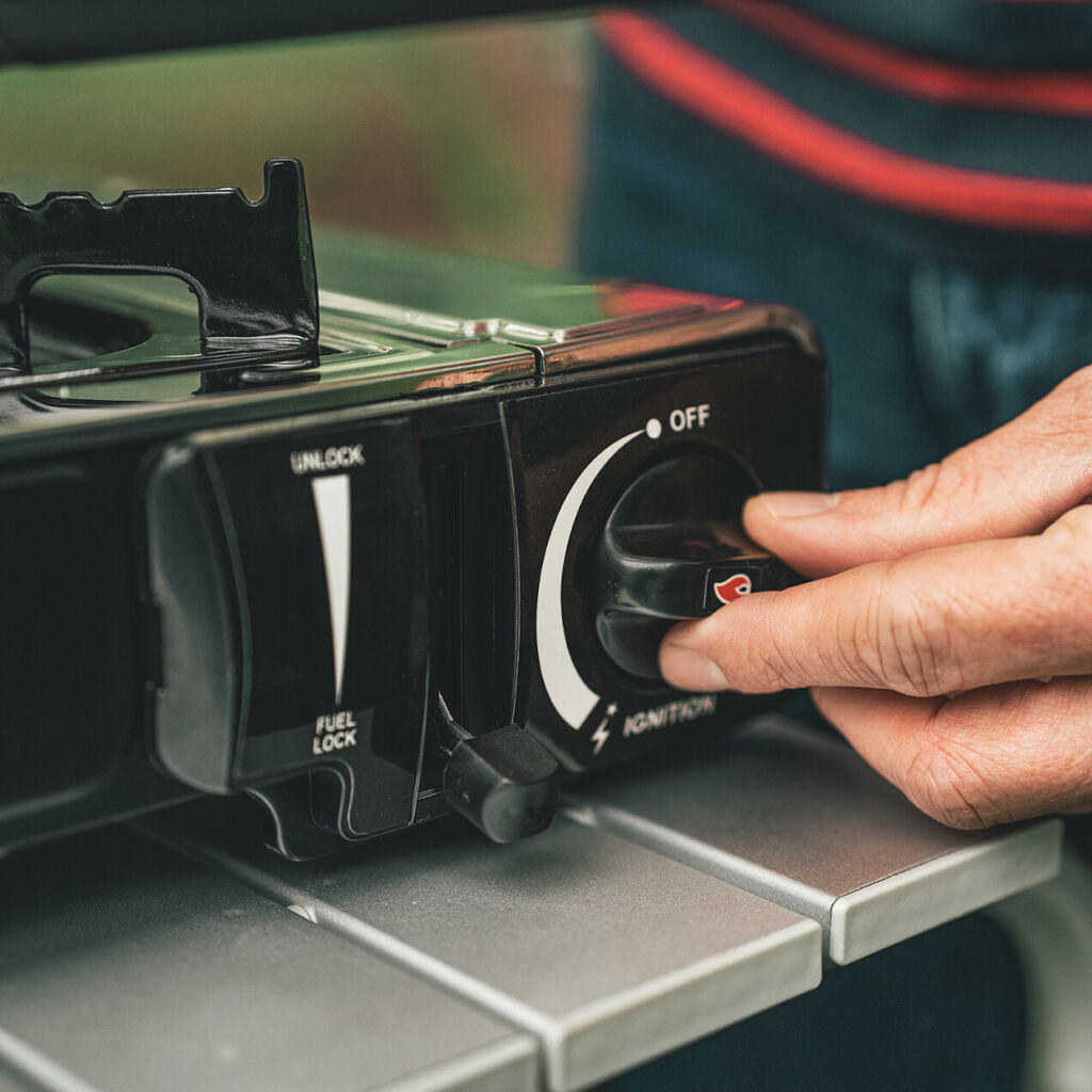 Campingkomfyr for engangsflasker med en brenner på 2200W. Innebygd tenner og stort effektvred gjør den enkel å håndtere. Veske for transport og oppbevaring følger med.