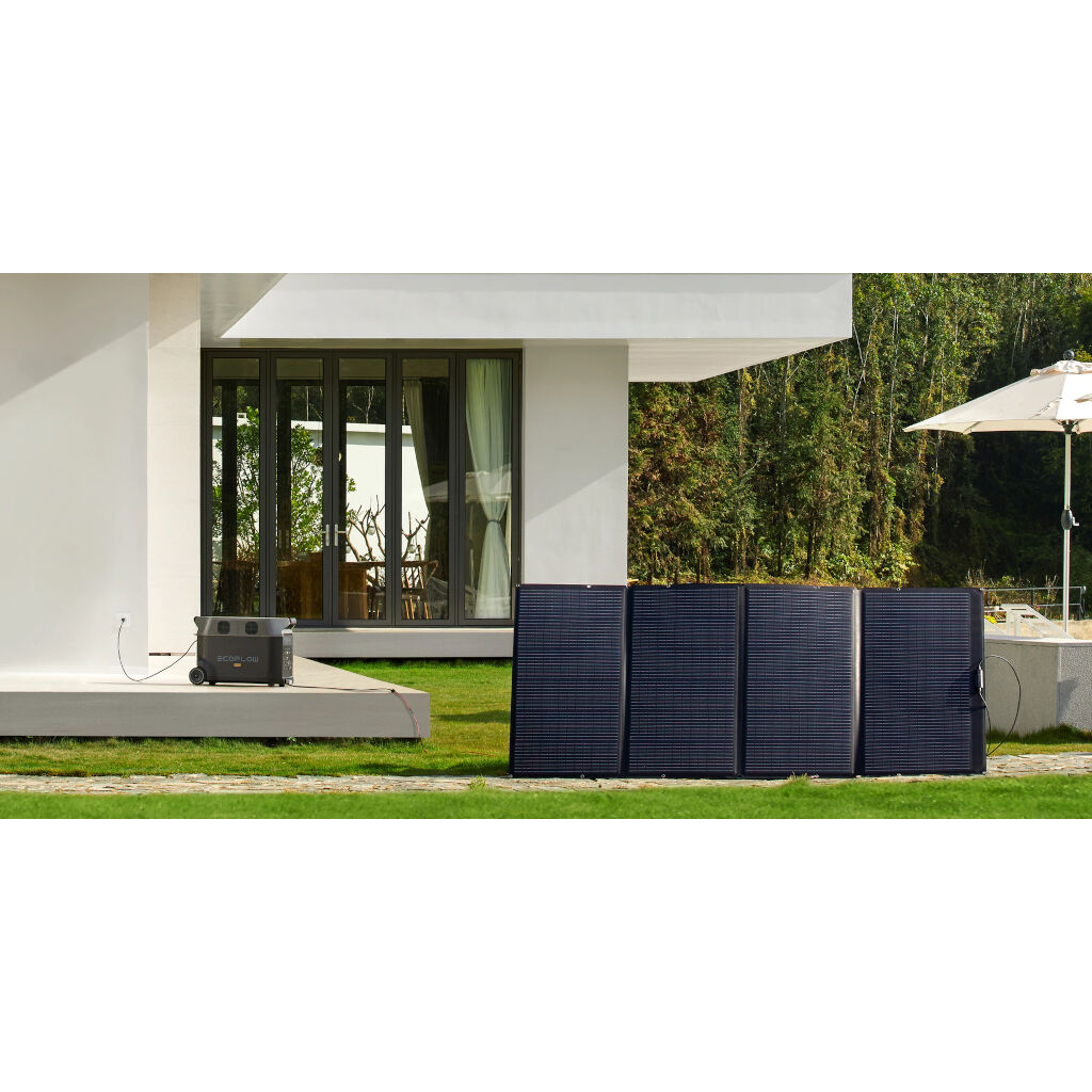 Meget stor solpanel for rask lading av en større power station eller for andre enheter som støtter MC4-kontakter. Solcelleteknologi som gir lading selv ved dårlig vær. Slitesterk veske og innebygd stativ gjør den enkel å håndtere uansett miljø.