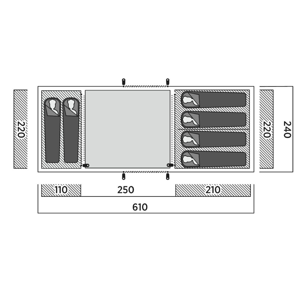 Teltet har tre sovekabiner, plassert i en vis-a-vis-design med to på den ene siden og én på den andre. Sovekabinene er romslige og kan deles av med glidelås-skillevegger. Mørke vegger og tak beskytter mot morgensolen og gir en bedre nattsøvn – en ekstra fordel for barnefamilier.