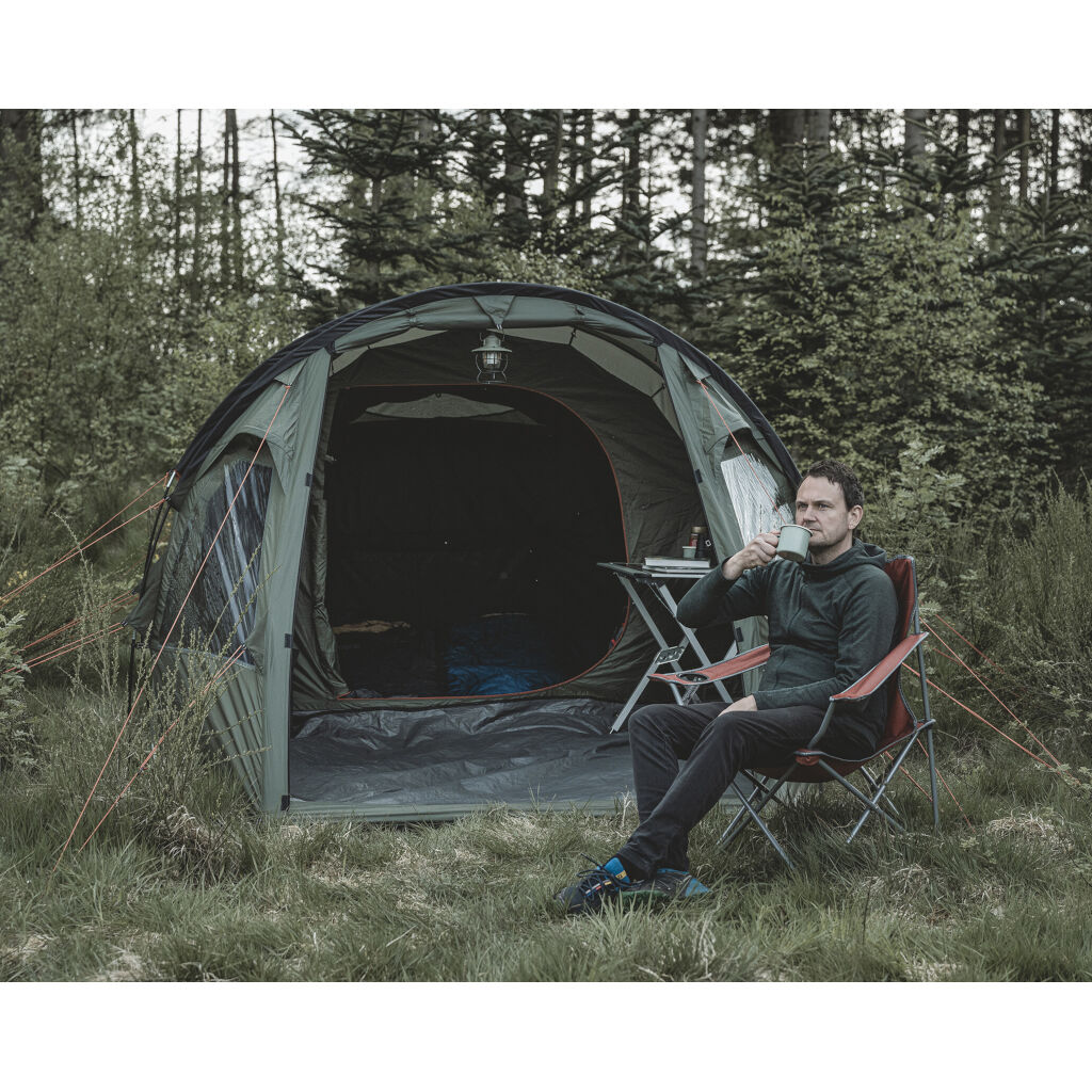 Oppholdsrommet er romslig, og takket være vinduene på begge sider får teltet godt med naturlig lys. Hvis man vil redusere innsyn eller lys, har alle vinduer innebygde gardiner. På regnværsdager er det god plass til å spise og sosialisere, og rommet kan enkelt innredes med et lite bord og stoler.