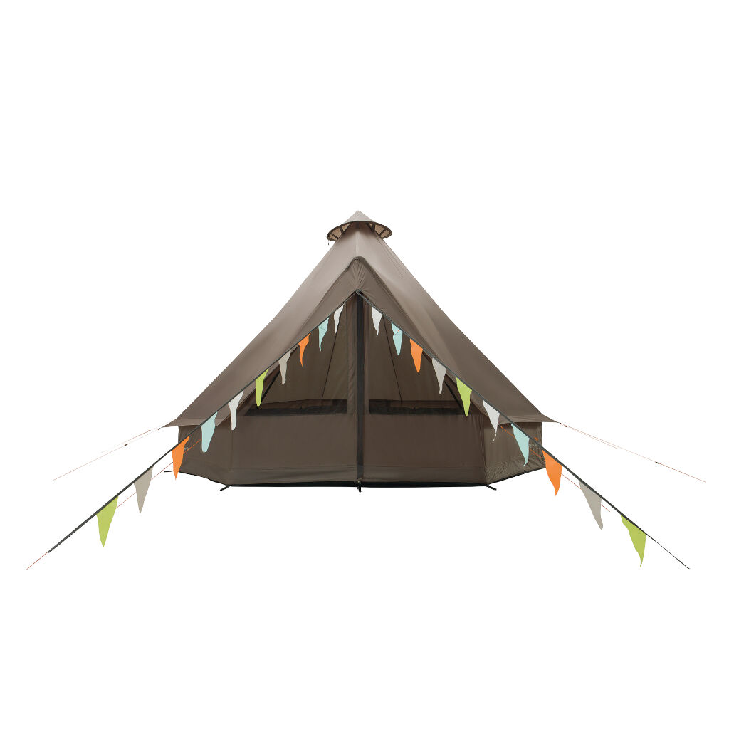 Easy Camp Vaulen Tipi er et romslig telt med et klassisk tipidesign som rommer opptil syv personer. Med en midtstang og en A-rammestang over inngangen får du mer plass innvendig og en beskyttet inngang. Den tildekkede takventilasjonen og tre lave ventiler sikrer god luftsirkulasjon, mens den regnbeskyttede døren og det fleksible gulvet gir ekstra komfort. Perfekt for familiecamping, festivaler og glamping.
