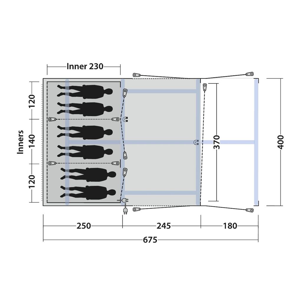 Outwell Boston 6 Air TC er et familietelt tilpasset familier eller grupper på opptil 6 personer, men vi anbefaler det også til familier med 2 eller 3 barn, da ekstra plass i både soverom og oppholdsrom gir mer rom for bagasje og bredere senger. Oppholdsrommet med store vinduer gjør teltet lyst og trivelig å oppholde seg i, slik at det alltid er plass til å spise og være sammen – uansett vær. Den store skjermede frontinngangen gir en uteplass å sitte på eller oppbevare utstyr under. Sidene kan åpnes på dager hvor man kun ønsker skygge. Den store frontdøren kan åpnes i to seksjoner, slik at den kan åpnes helt på varme dager eller delvis for å få mer ventilasjon samtidig som man beholder beskyttelse mot vind og innsyn. Det integrerte gulvet som er sydd til ytterteltet beskytter mot vind, insekter og smuss.