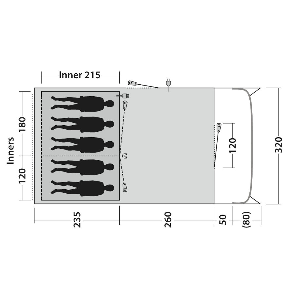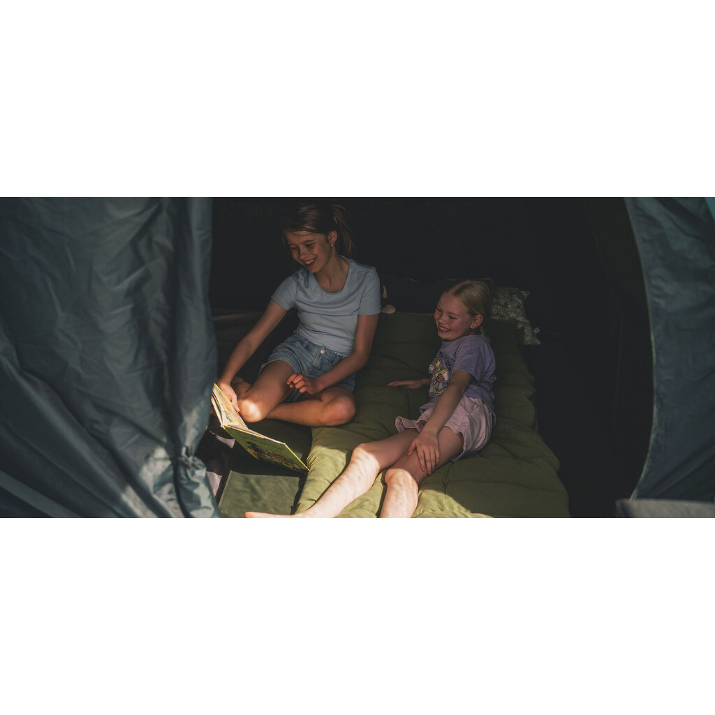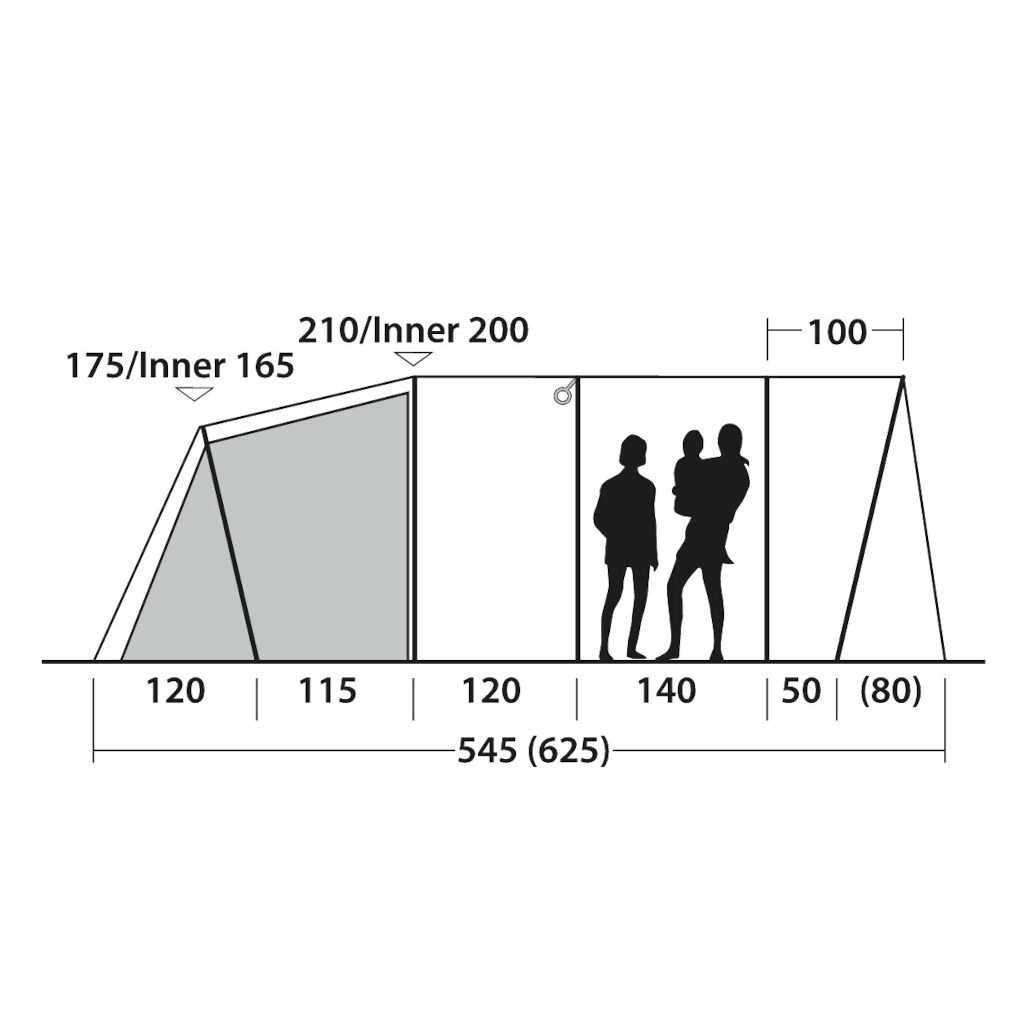 Stort familietelt med to soverom, en romslig og lys oppholdsrom og en beskyttet inngang foran. Oppholdsrommet har, takket være det fastsydde gulvet som beskytter mot trekk, småkryp og kondens, et veldig behagelig klima for å spise og være sosial. En mørk soveavdeling med en avtakbar skillevegg mellom soverommene gir utmerket sovekomfort, enten du vil dele opp familien eller samle alle i ett soverom. Perfekt for familien som ønsker et virkelig romslig campingtelt.